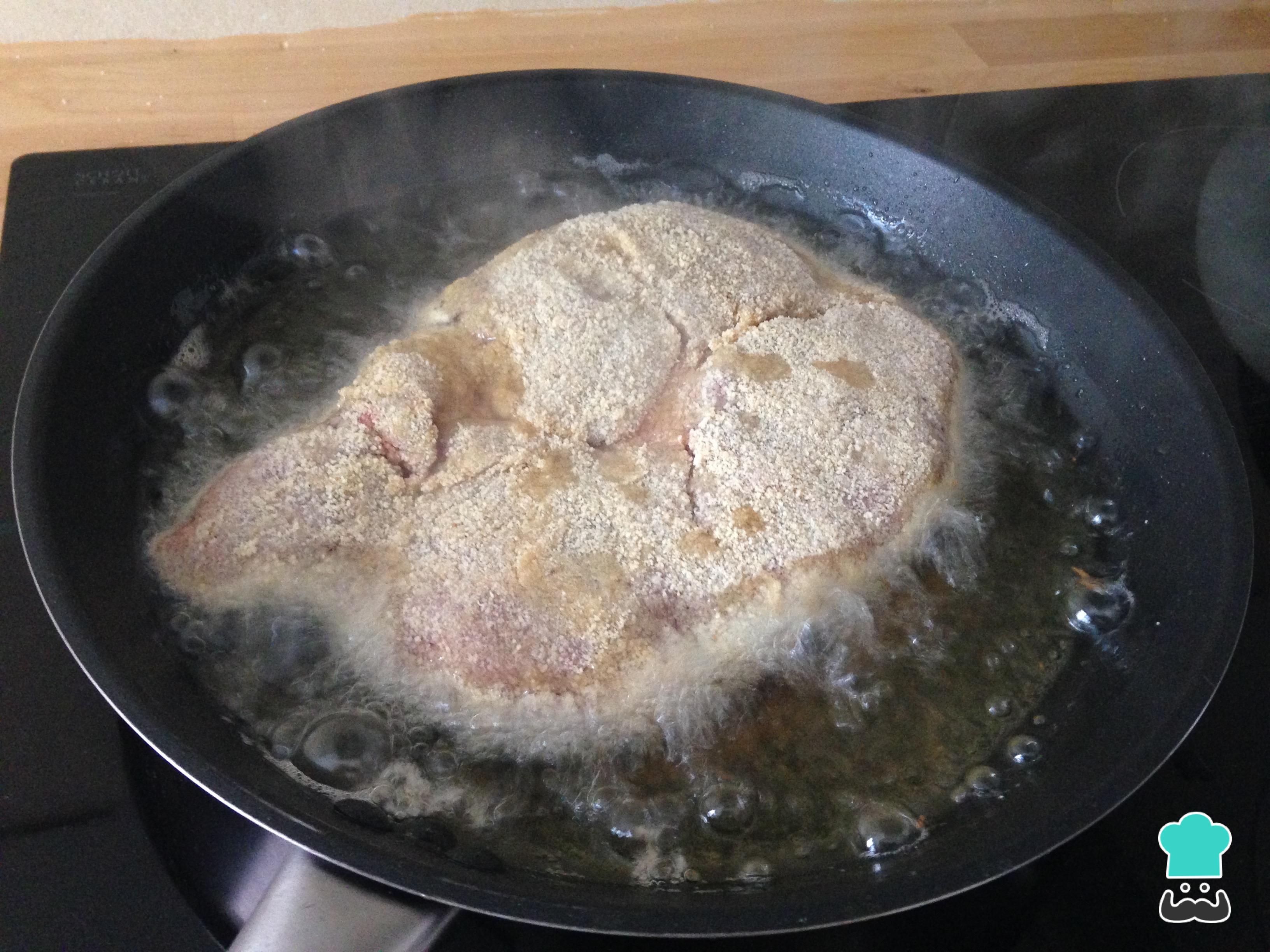 Freímos el cachopo de ternera en abundante aceite hirviendo. Al principio, el aceite tiene que estar muy caliente y, una vez metamos el cachopo, lo bajamos a fuego medio para que no se queme y pueda cocinarse perfectamente, dando como resultado un cachopo crujiente por fuera y jugoso por dentro.