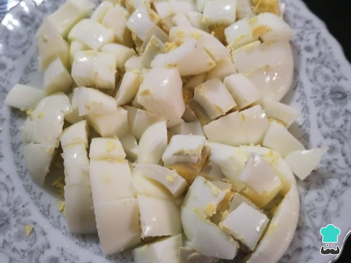 Para empezar a preparar la receta de caigua rellena de pollo, cuece los huevos y luego córtalos en pequeños trozos cuadrados.