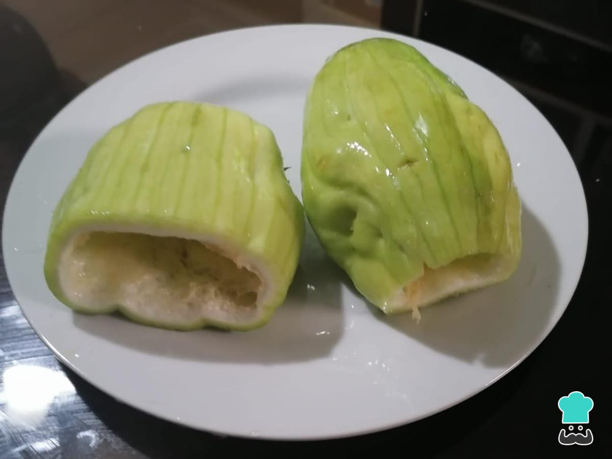 Corta las caiguas por la mitad, de tal forma que luego puedan ser rellenadas. Fíjate en la imagen para hacerlo del mismo modo.