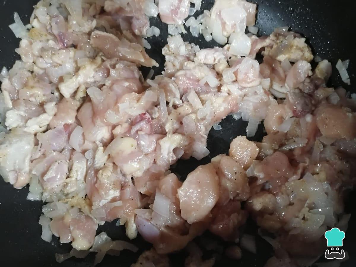 Para preparar el relleno de la caigua, calienta el aceite en una olla, echa la cebolla y sofríela por un minuto. Luego, agrega el ajo molido y el tomate picado y sofríe por un minuto más. Incorpora el pollo previamente cortado en pequeños trozos y sazonado con sal y pimienta y deja cocinar por 3 minutos.