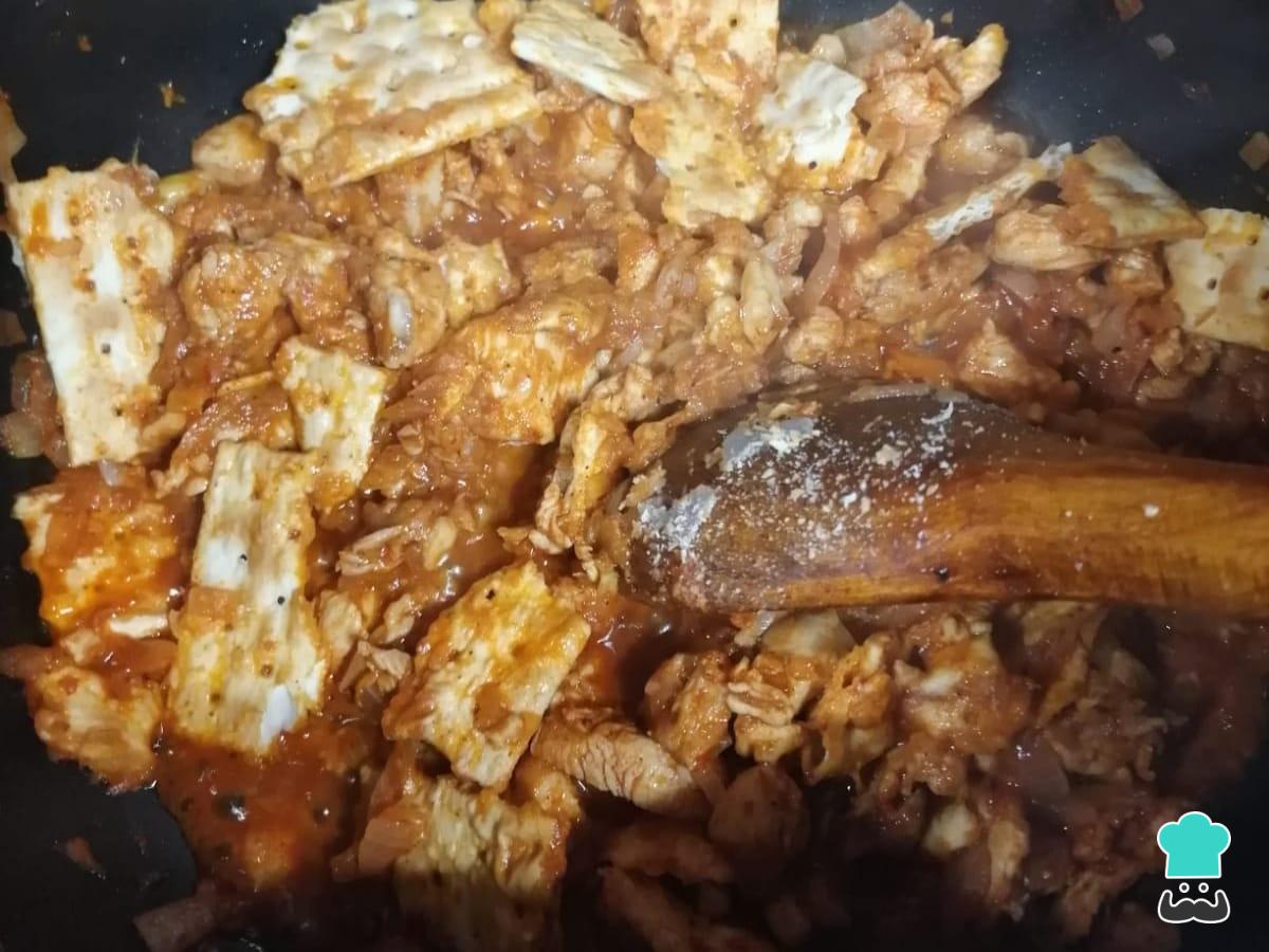 Agrega la pasta de ají panca junto con la galleta de soda y deja cocinar a fuego suave por unos 5 minutos. Revuelve ocasionalmente para ayudar a que se deshaga la galleta. Si ves que se está secando el aderezo, no dudes en ir agregando un poco de caldo de pollo. S quieres, puedes preparar caldo de pollo casero siguiendo los pasos de esta otra receta.