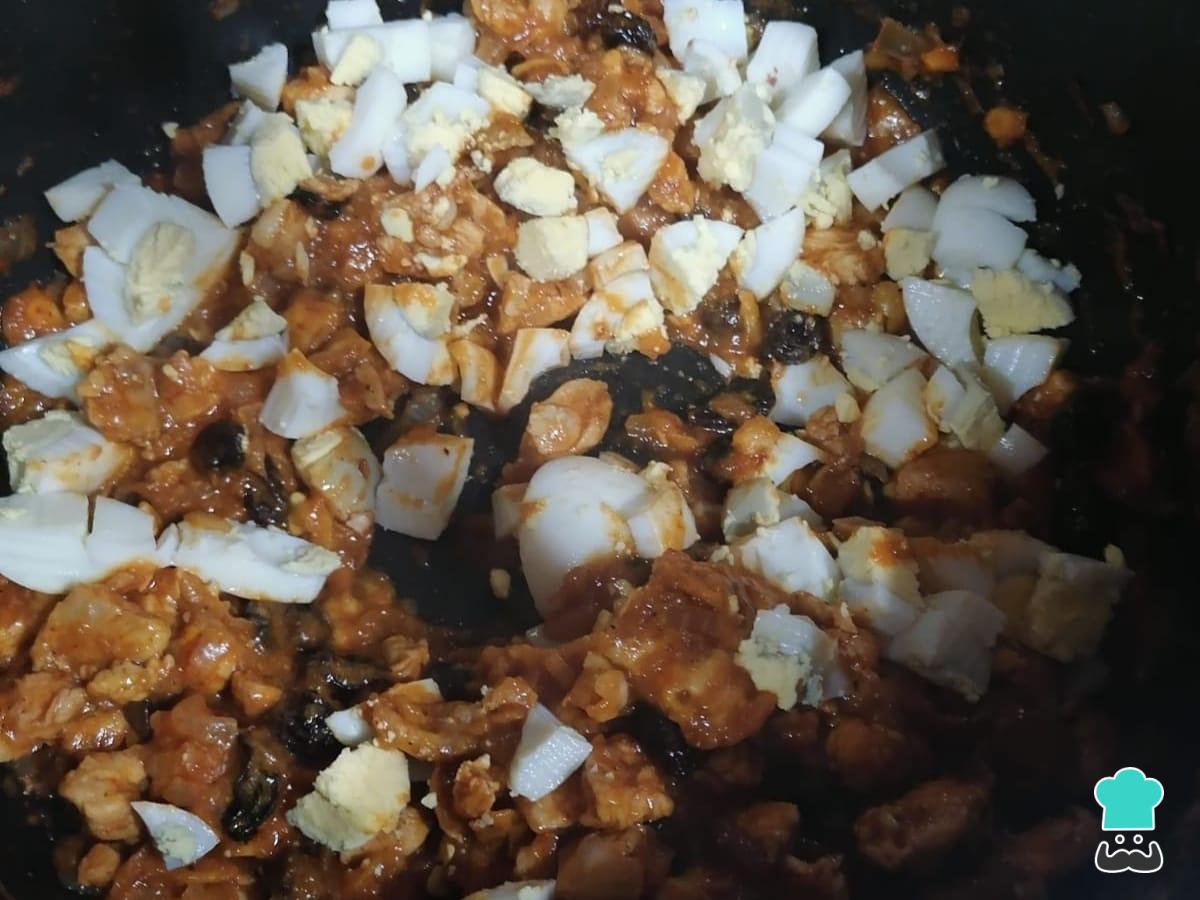 Para terminar de preparar el relleno, añade las pasas y el huevo cortado. Cocina durante un par de minutos moviendo suavemente y listo.
