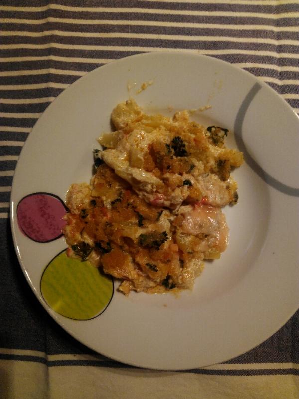 Separamos la olla del fuego y añadimos la nata líquida, mezclamos y pasamos el conjunto a un recipiente apto para el horno.