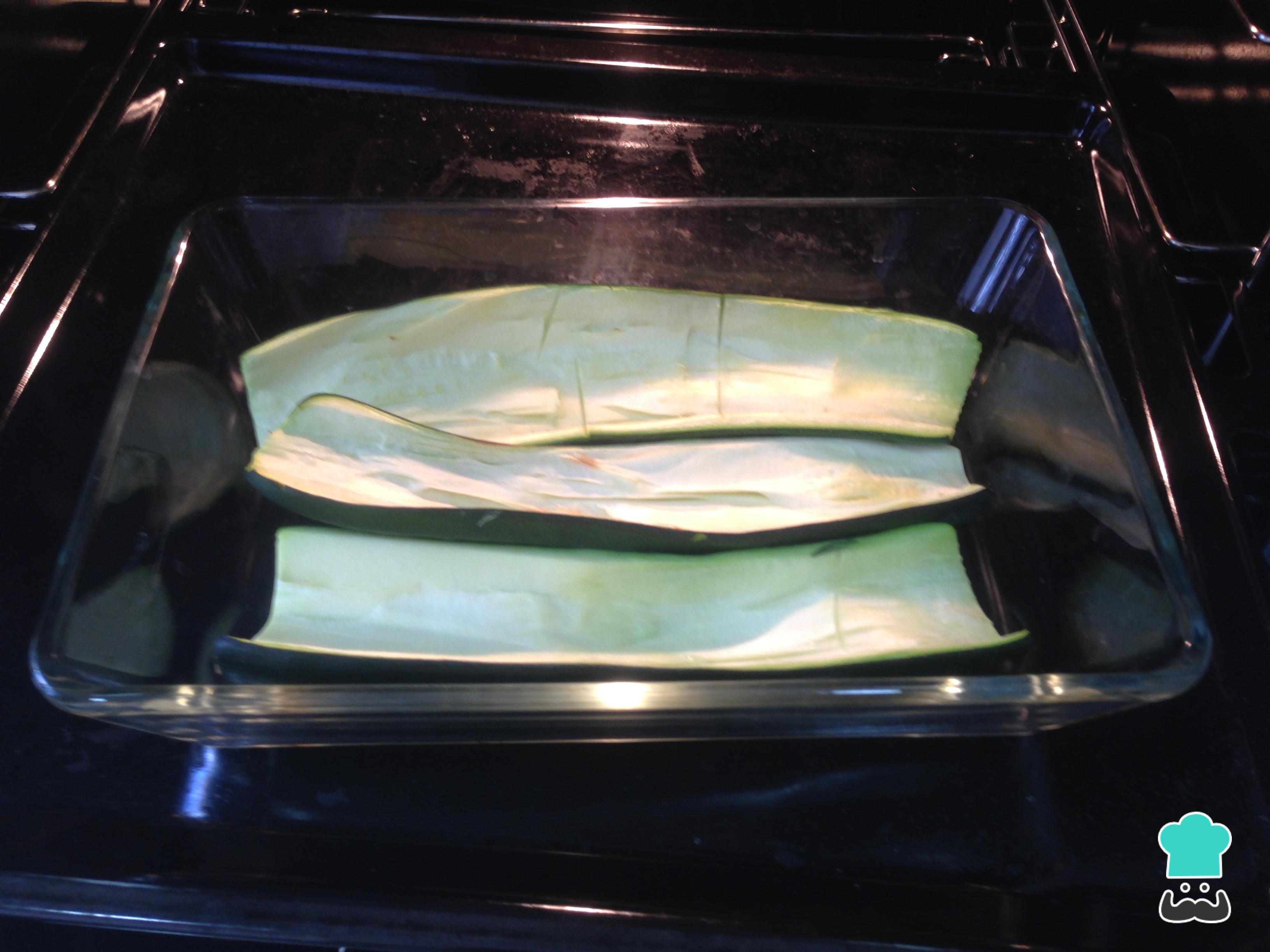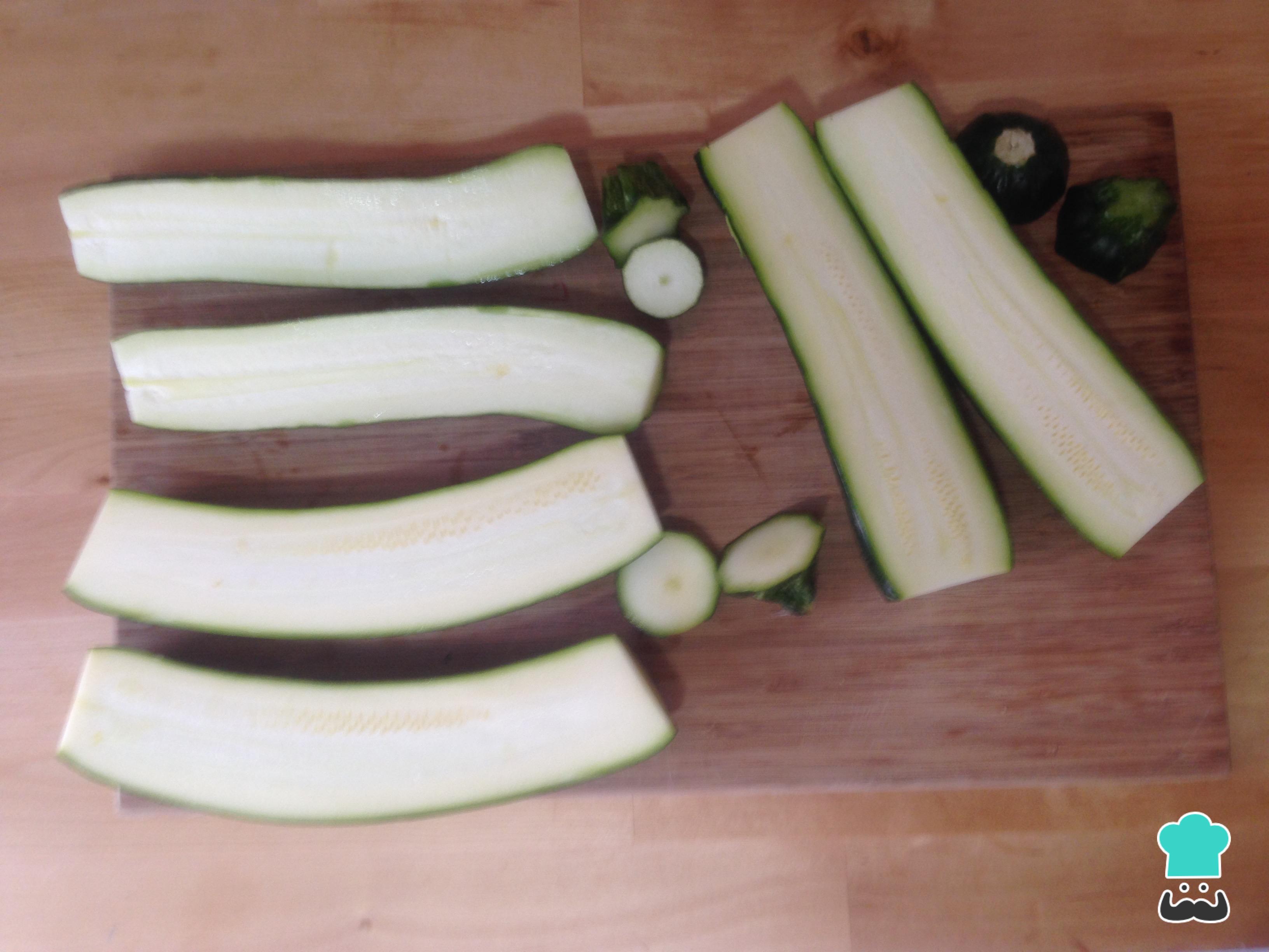 Quitamos los extremos de los calabacines y los partimos por la mitad, a lo largo, tal y como se ve en la foto.