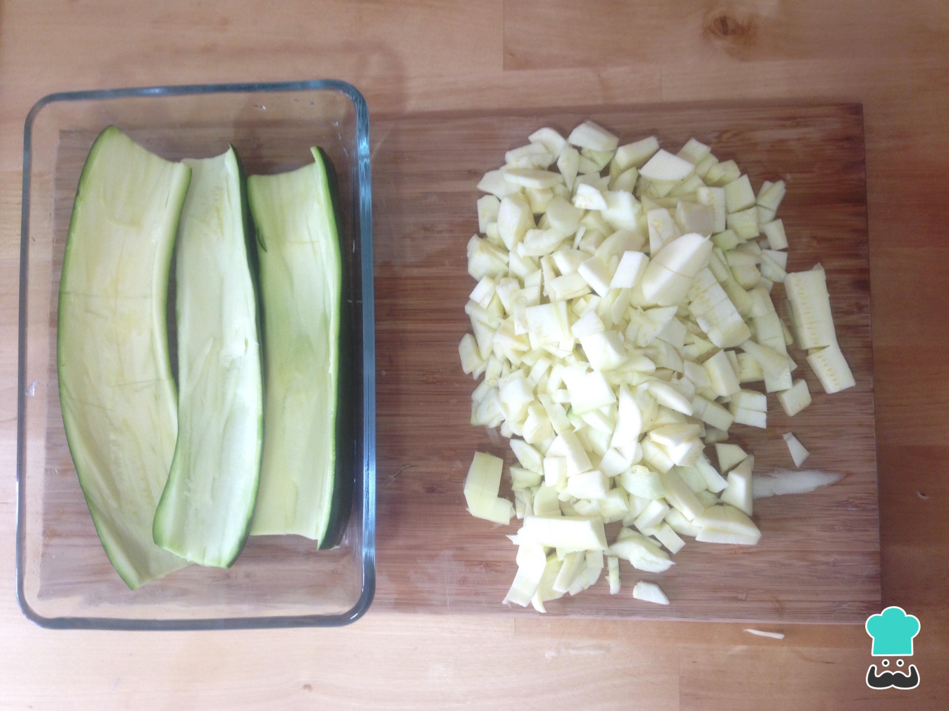 Sacamos la pulpa del calabacín y la cortamos en trocitos pequeños. Las cáscaras las disponemos en una bandeja de horno (más tarde las pondremos a hornear).