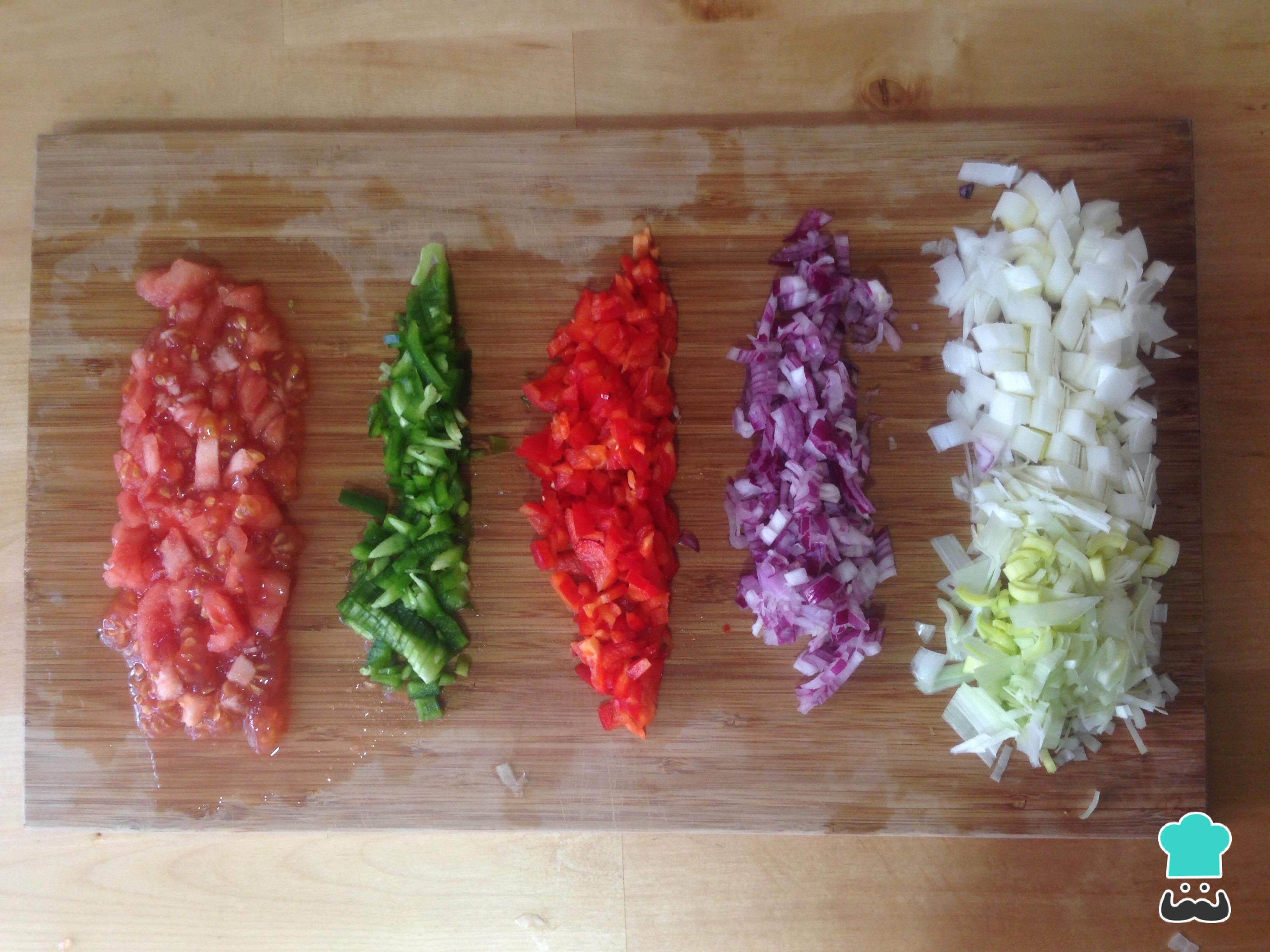 Por otra parte, cortamos el resto de verduras del mismo tamaño que el calabacín, en cuadraditos.