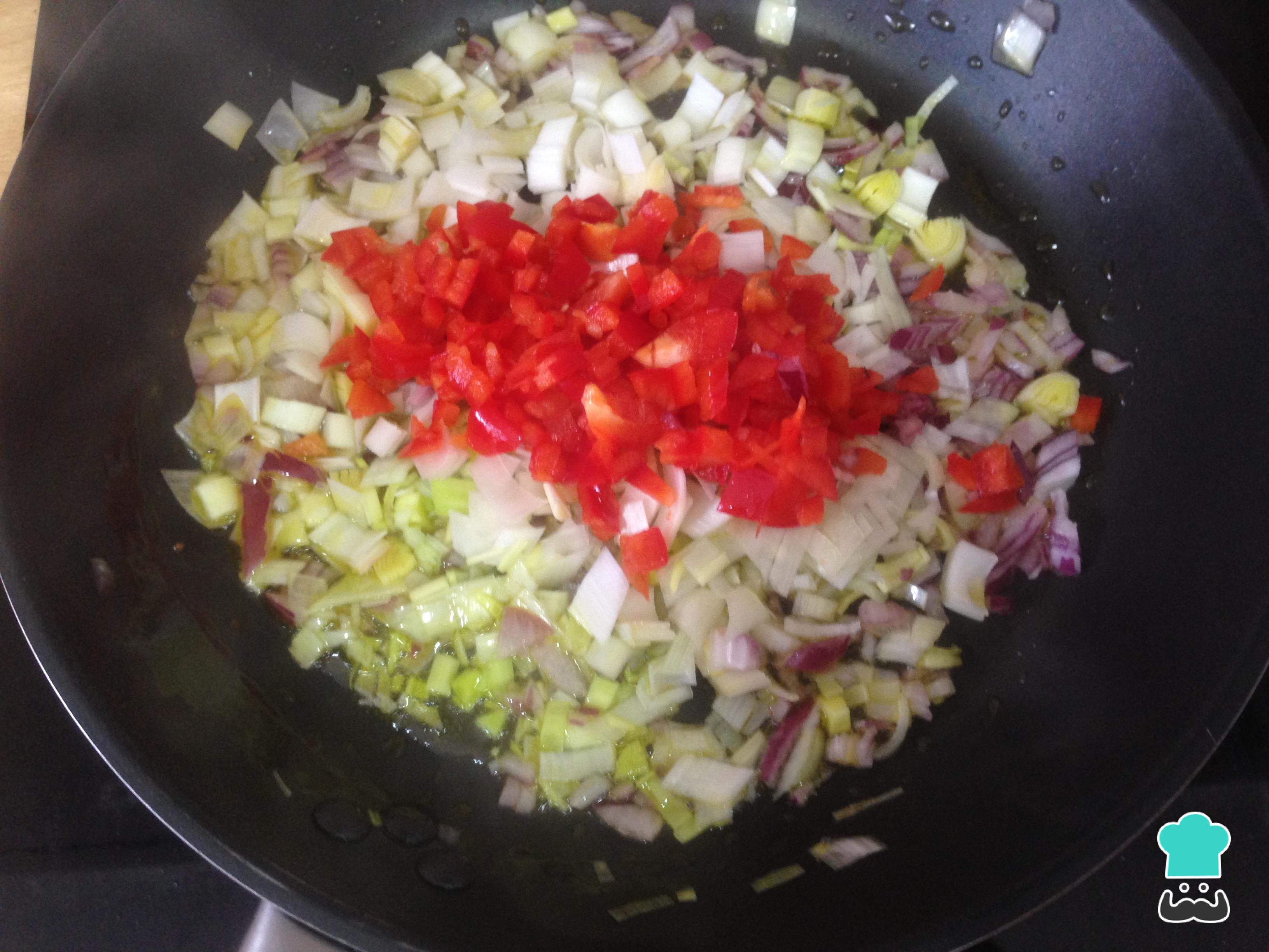 Hacemos un sofrito: primero añadimos la cebolla y el puerro, y a continuación los pimientos. Dejamos cocinar el relleno vegano durante cuatro minutos y añadimos un poco de sal y pimienta negra molida.