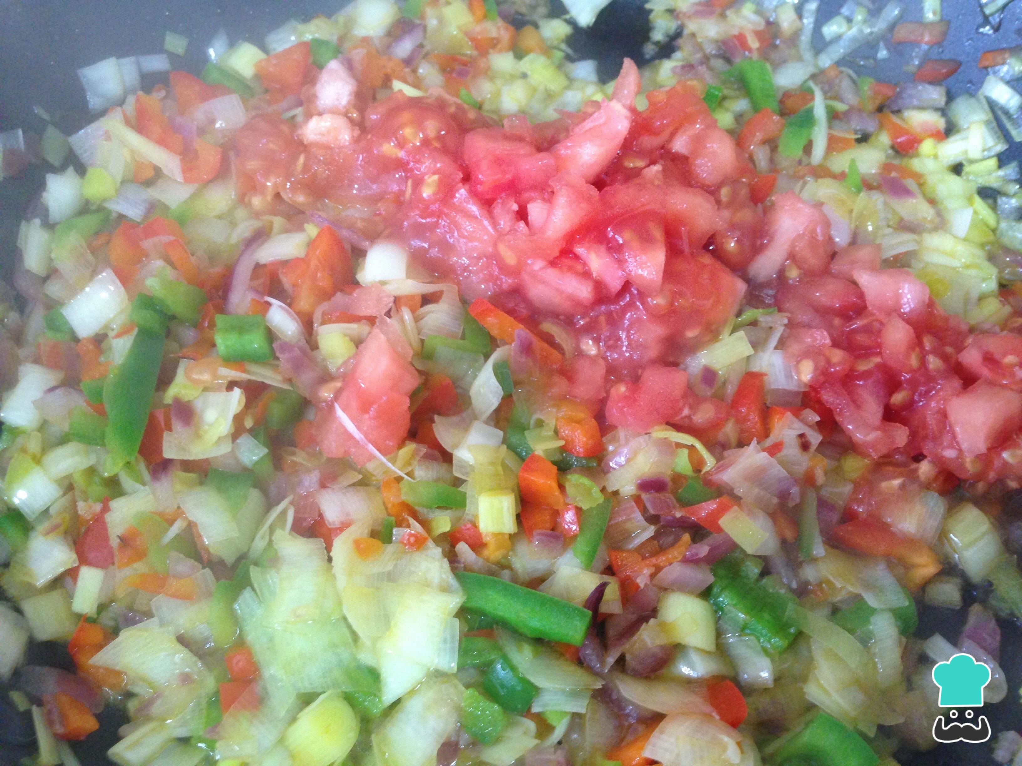 A continuación agregamos el tomate pelado y cortado en trozos pequeños. Cocinamos durante tres minutos y añadimos la pulpa de los calabacines troceados. Ponemos un poco más de sal si es necesario. Cocinamos hasta que todas las verduras estén tiernas.