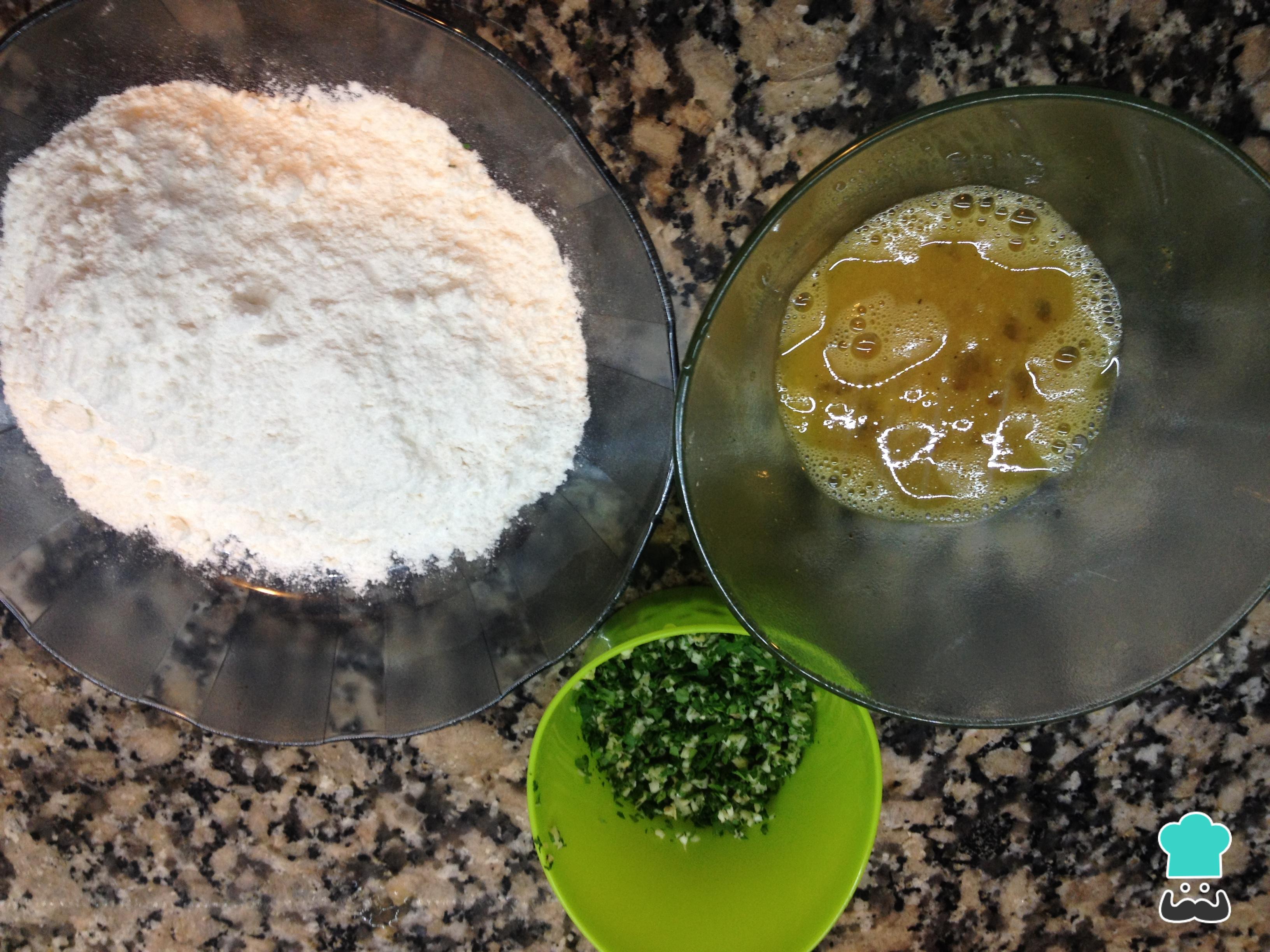 En otro recipiente batir ligeramente los 2 huevos, agregarle sal, pimienta negra y ajo en polvo ( opcional). En otro plato poner un poco de harina leudante (para enharinar las rabas) y en otro preparar la provenzal con perejil picado y 1 o 2 dientes de ajo picado.