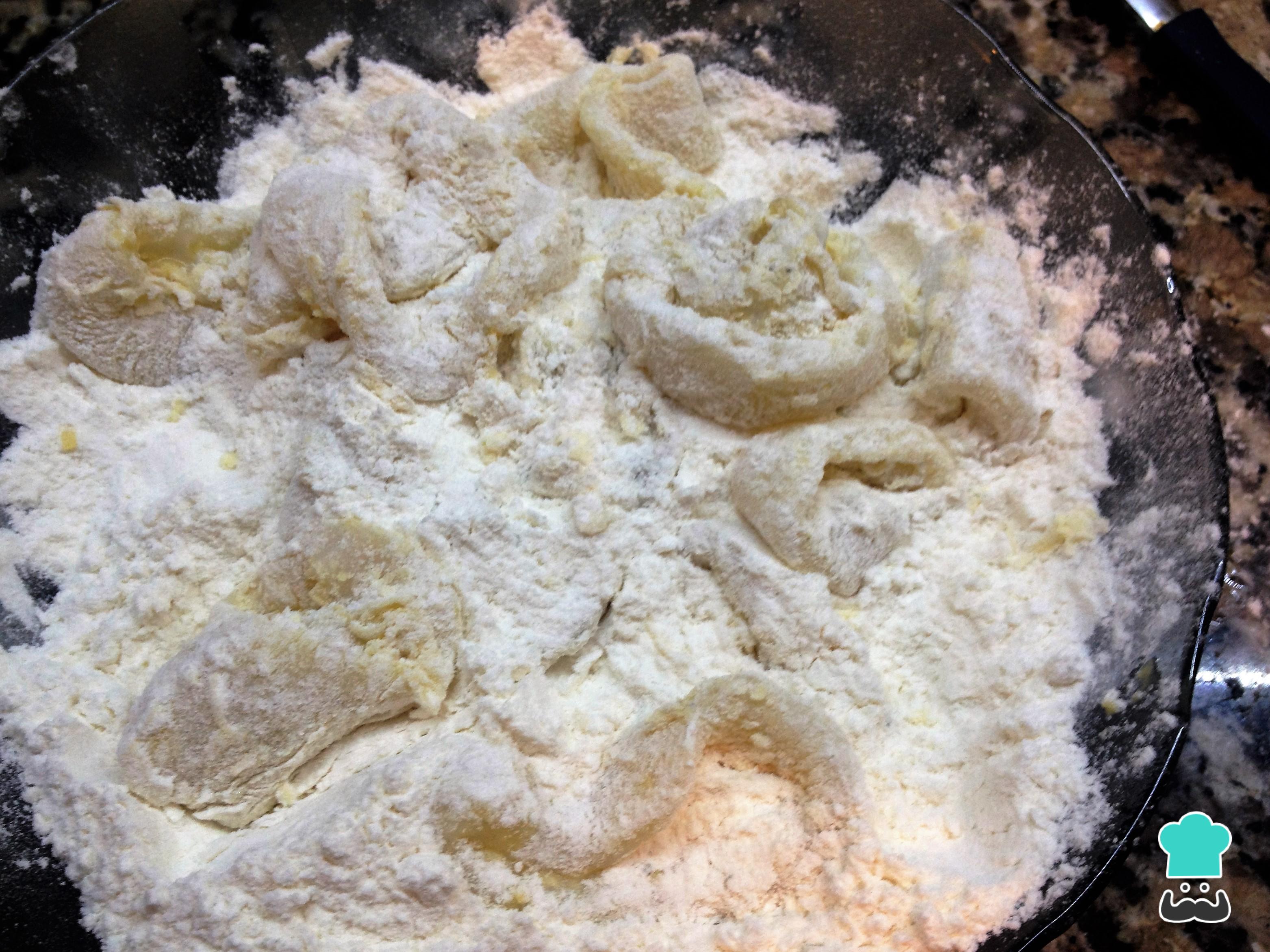 Luego pasar los calamares por harina leudante, pero enharinar solo los que en ese momento van a ir al aceite, no dejarlos mucho tiempo en la harina porque se humedecen y después los calamares a la provenzal no quedarán crocantes.
