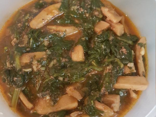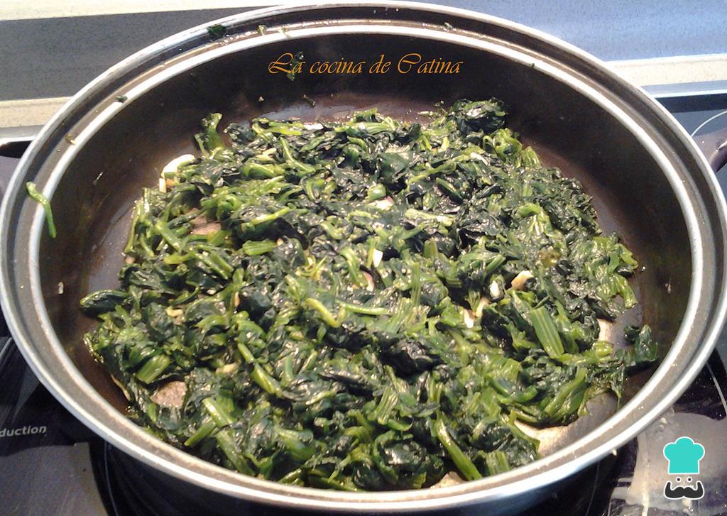 Mientras tanto, limpiamos las espinacas, lavamos y hervimos en una olla con agua hirviendo y un poco de sal. Una vez cocidas las escurrimos, las troceamos pequeñas y las sofreímos durante 4 o 5 minutos en una sartén con el resto del aceite que nos queda añadiéndole un diente de ajo pelado y aplastado.