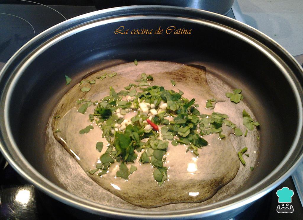 Limpiamos los calamares bien, lavamos, escurrimos y los cortamos en anillas. Después pelamos y picamos un diente de ajo, limpiamos y picamos la mitad del perejil, añadimos la guindilla y sofreímos este picadillo para los calamares con espinacas a fuego lento en una cacerola con tres cucharadas de aceite de oliva durante unos minutos.