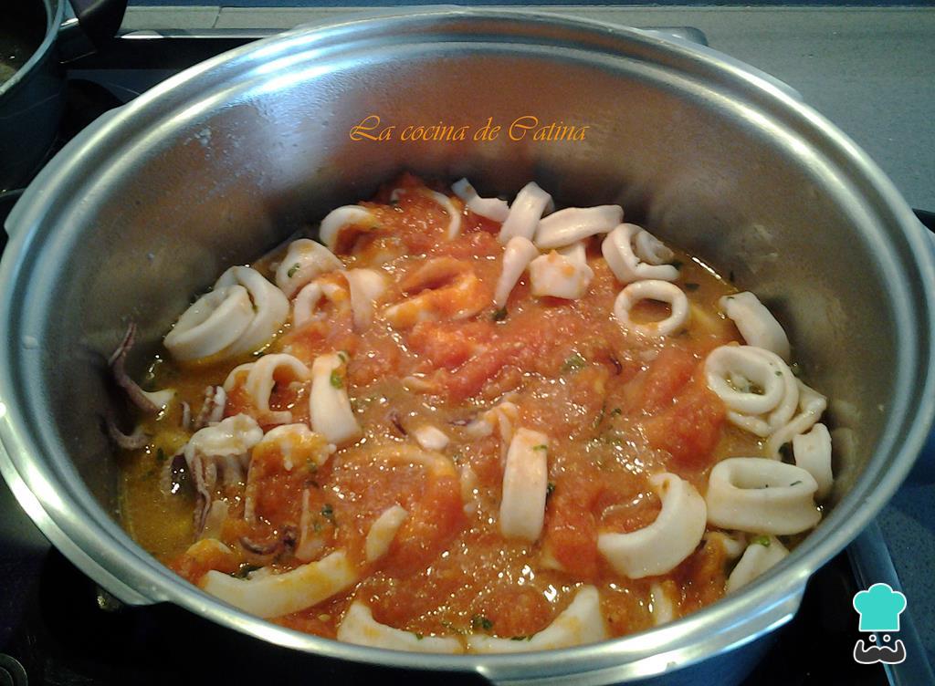 A continuación, añadimos los calamares, removemos con una cuchara de madera, sazonamos y dejamos que tomen sabor.