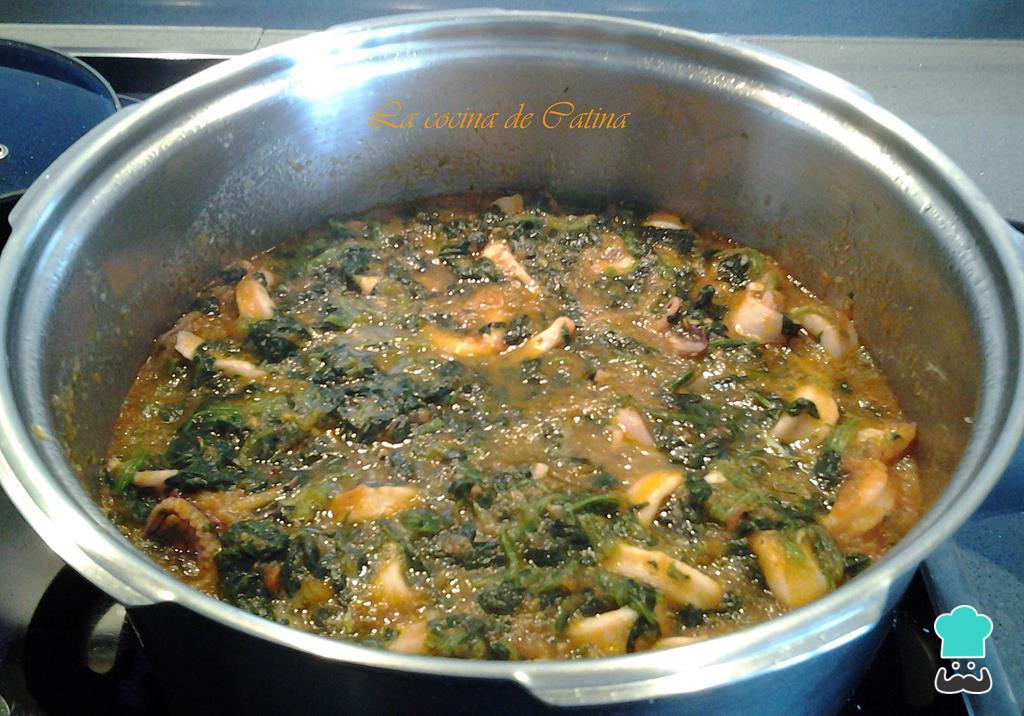 A continuación, retiramos el ajo y añadimos las espinacas a los calamares. Rectificamos de sal si es necesario y continuamos cociendo 15 minutos más a fuego lento removiendo a menudo.