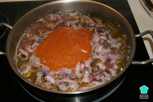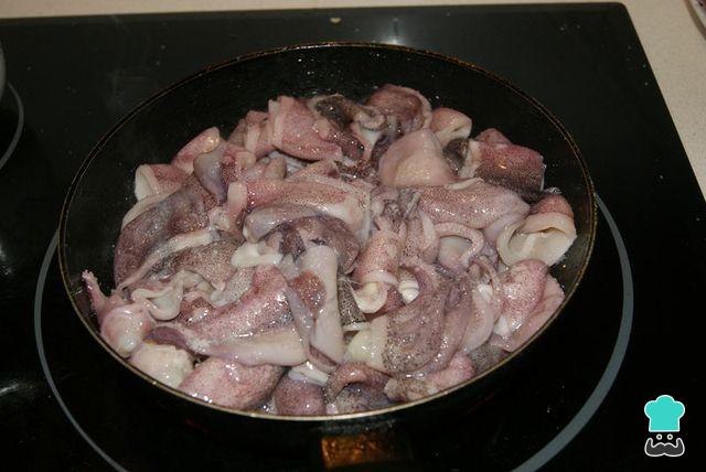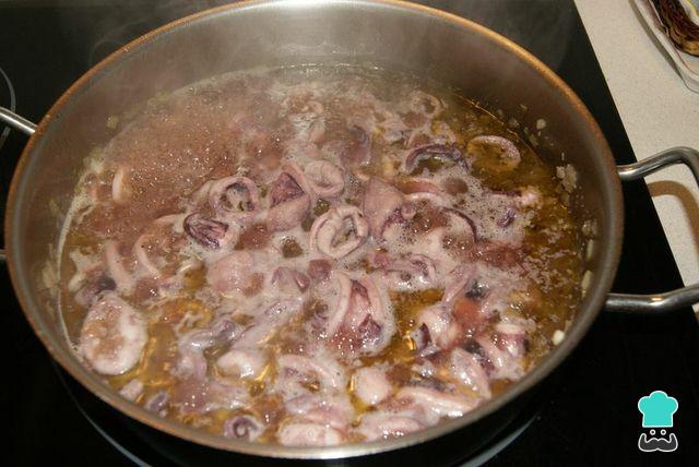 Una vez pochada, agregamos los calamares, previamente cortados en trozos de unos 4 cm. Cocinamos unos 10 minutos.