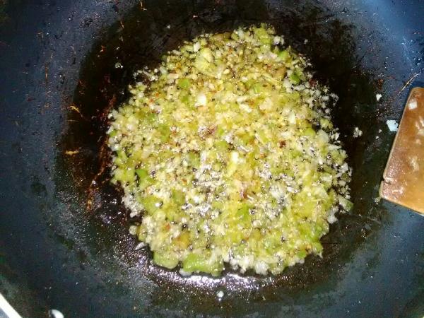 Luego de unos minutos, antes de que empiece a dorarse el ajo, añade el pimiento troceado en cuadrados no muy grandes y deja cocinar todo unos minutos más.
