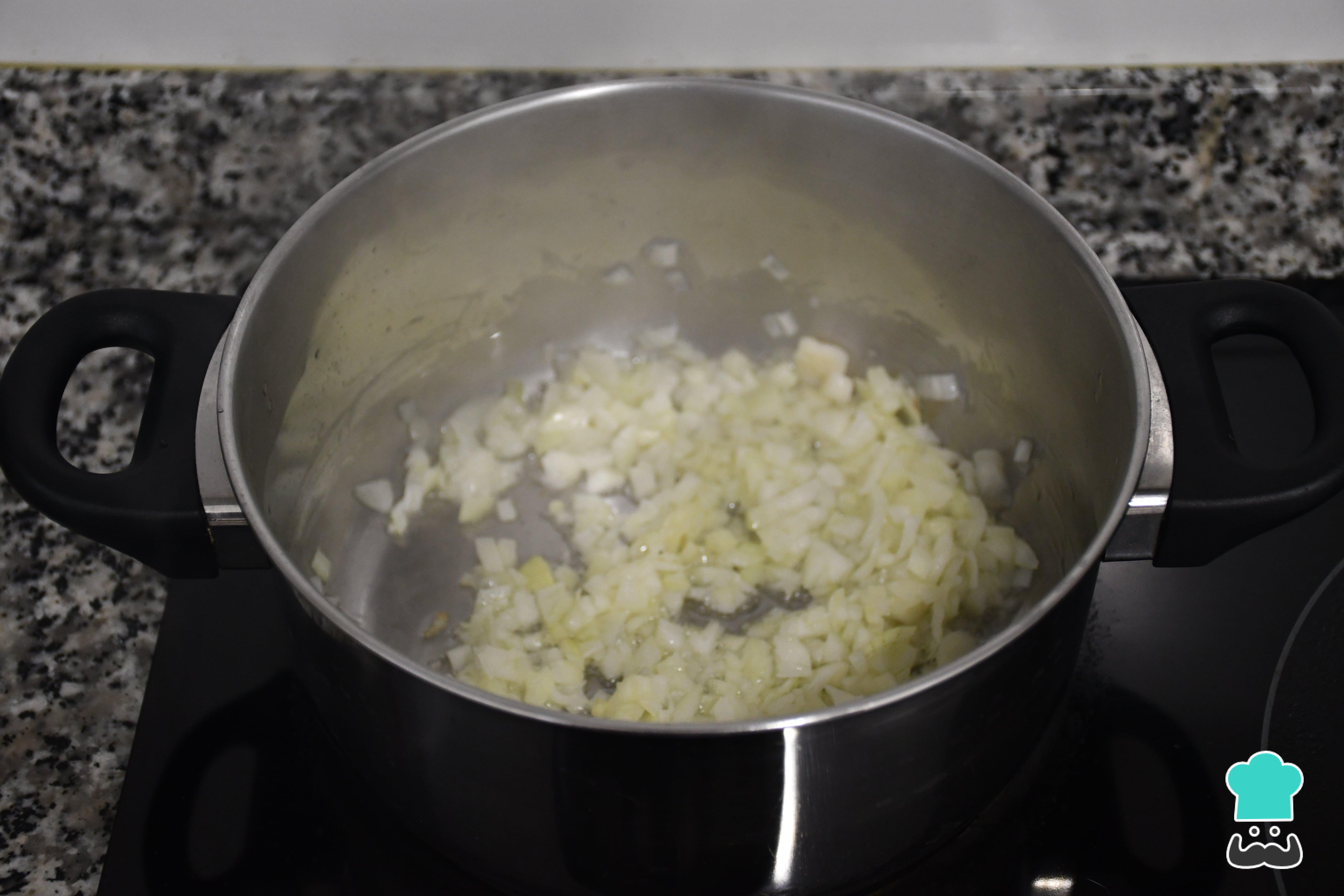 Empieza por el relleno de los calamares. Para ello, introduce en una olla la cebolla picada muy fina con un chorrito de aceite de oliva y cocínala 2 minutos a fuego medio.
