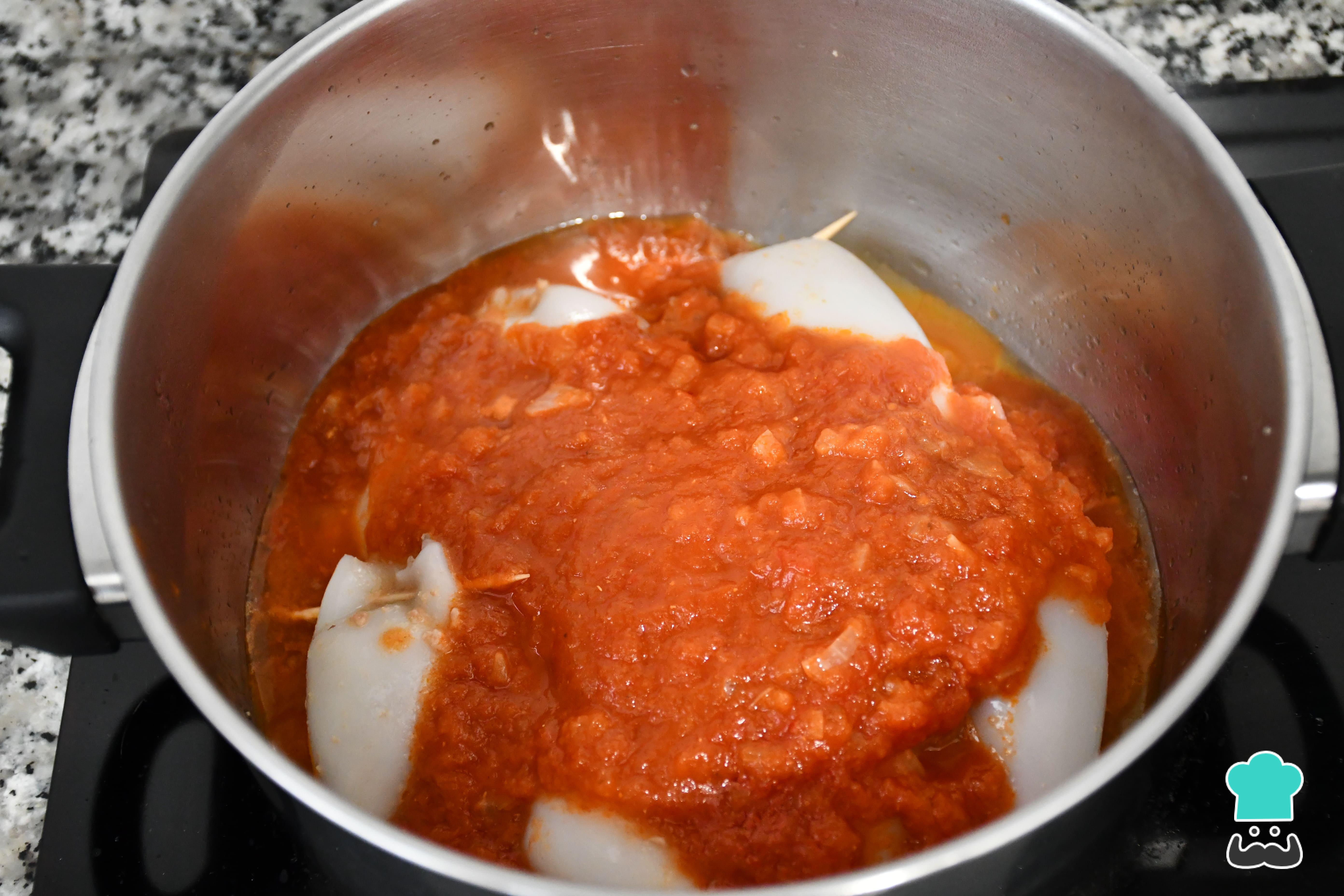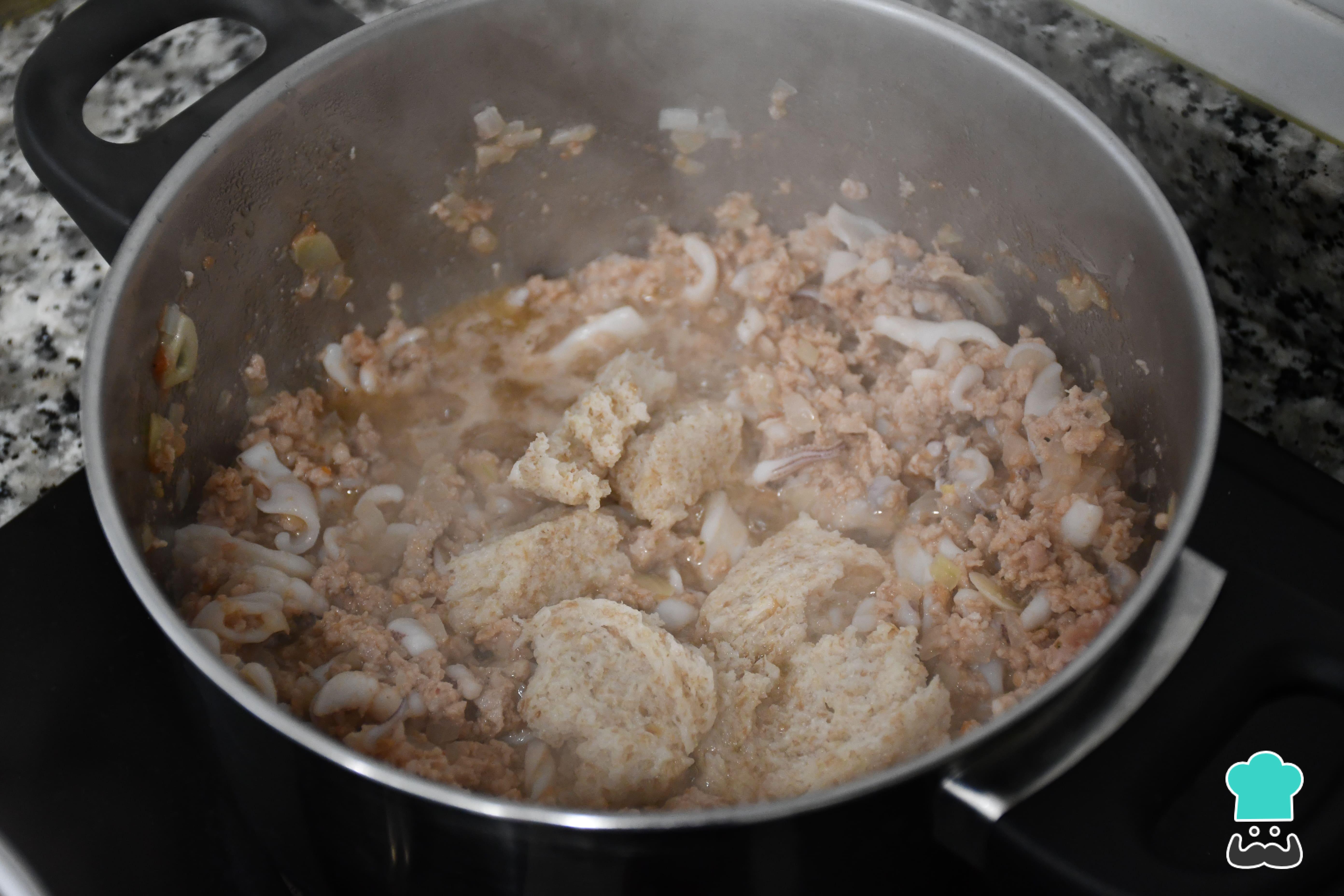 Si te apetece disfrutar de unos calamares rellenos de carne y huevo, puedes cocer un par de huevos con antelación, picarlos y añadirlos ahora a la olla. También puedes añadir gambas peladas y troceadas.