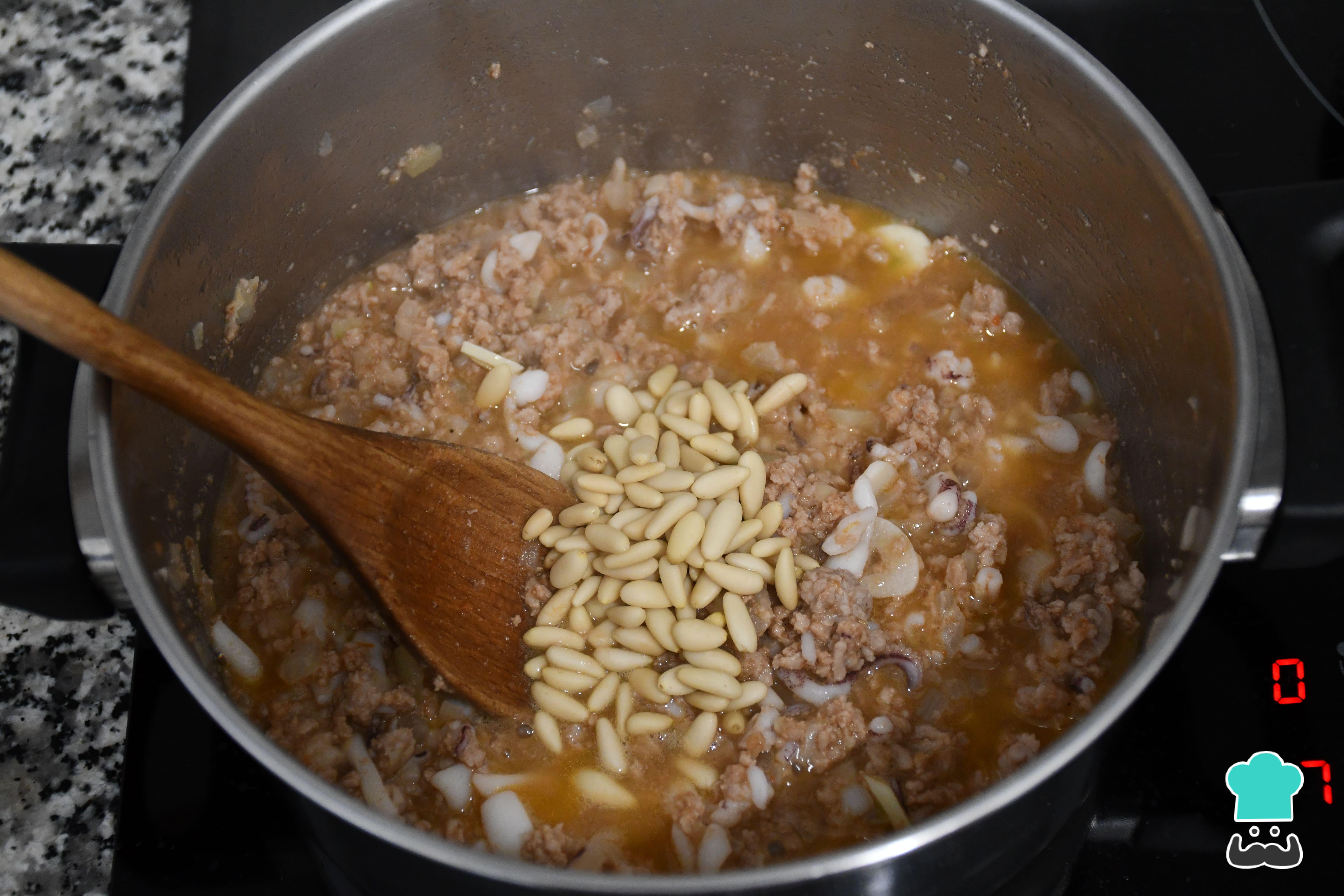 Incorpora un puñado de piñones. Mezcla bien, apaga el fuego y deja que el relleno se enfríe antes de utilizarlo. Los piñones aportarán a los calamares rellenos de carne un extra de sabor y textura, pero puedes sustituirlos por otro fruto seco o eliminarlos.