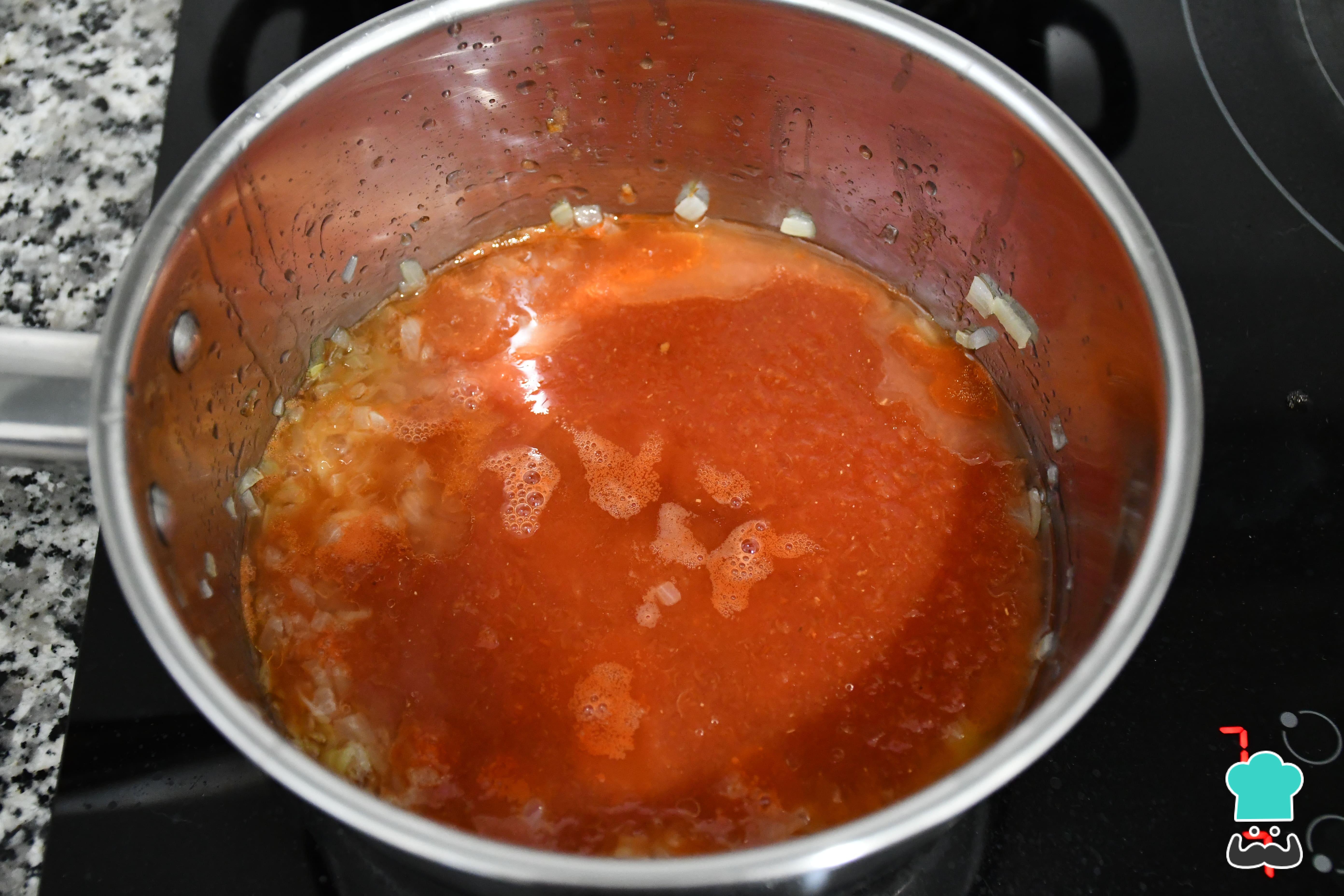 Mientras tanto, prepara la salsa. Para hacerla, en un cazo con un chorro de aceite de oliva pon a cocinar la cebolla picada durante 2 minutos. Pasado este tiempo, añade el tomate triturado restante y el vasito de vino blanco. Deja reducir unos 5 minutos aproximadamente y resérvala.