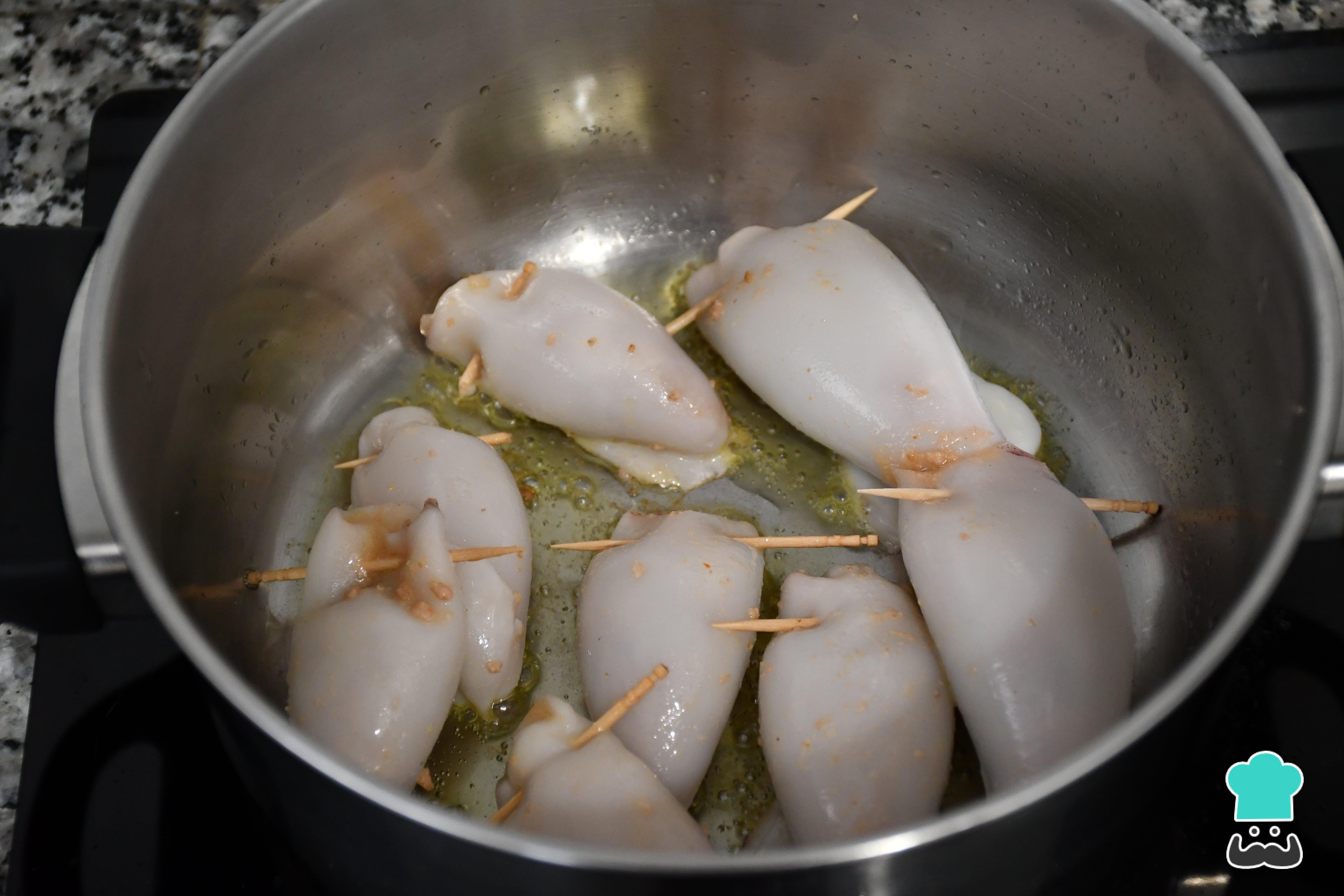 Para rellenar los calamares, introduce el relleno con ayuda de una cucharilla de café dejando un espacio para cerrarlos con un palillo. Deben quedar bien rellenos. Hecho esto, coloca los calamares rellenos de carne en una olla con un chorro de aceite para sellarlos por un lado, como se muestra en la fotografía.