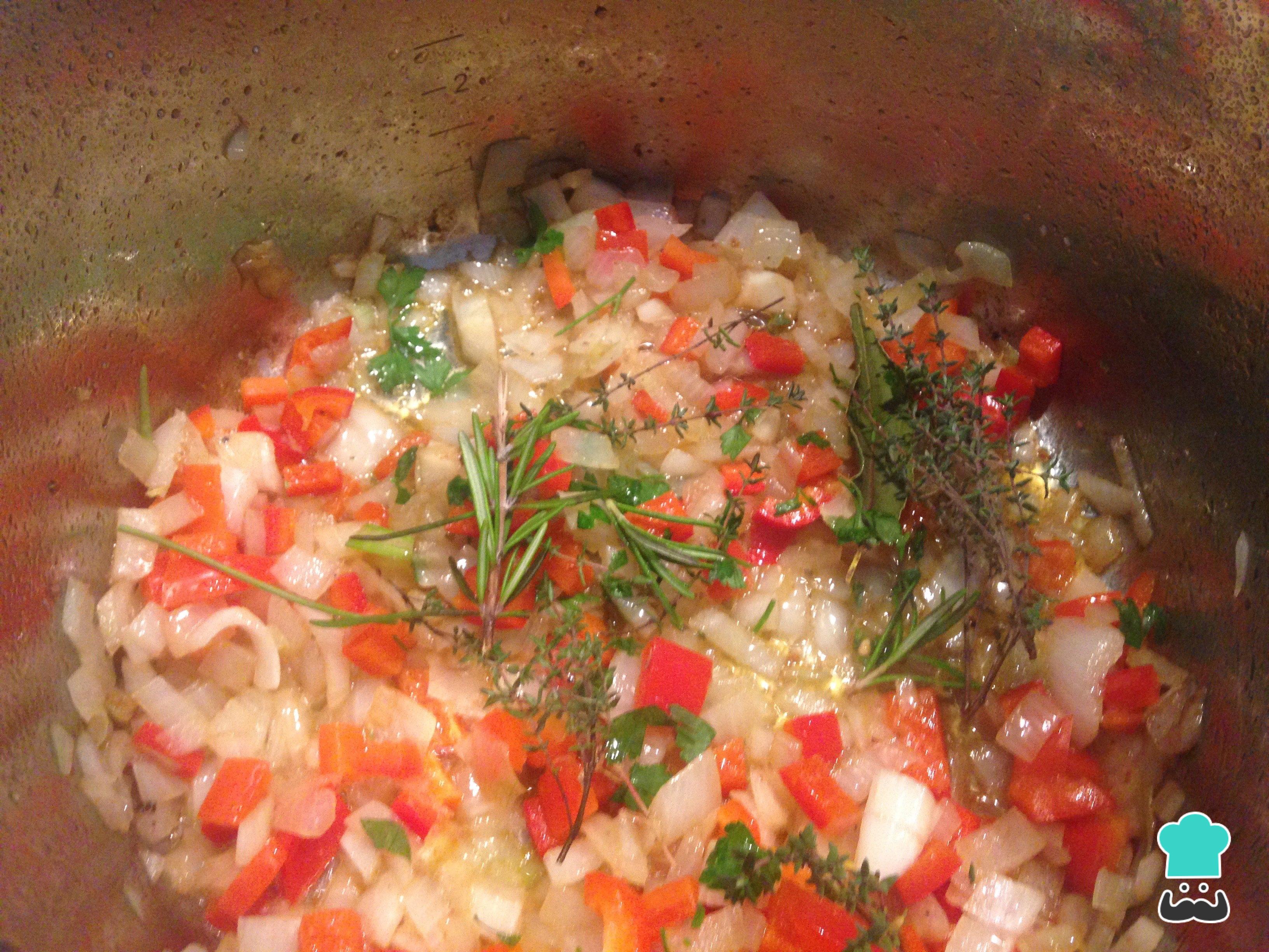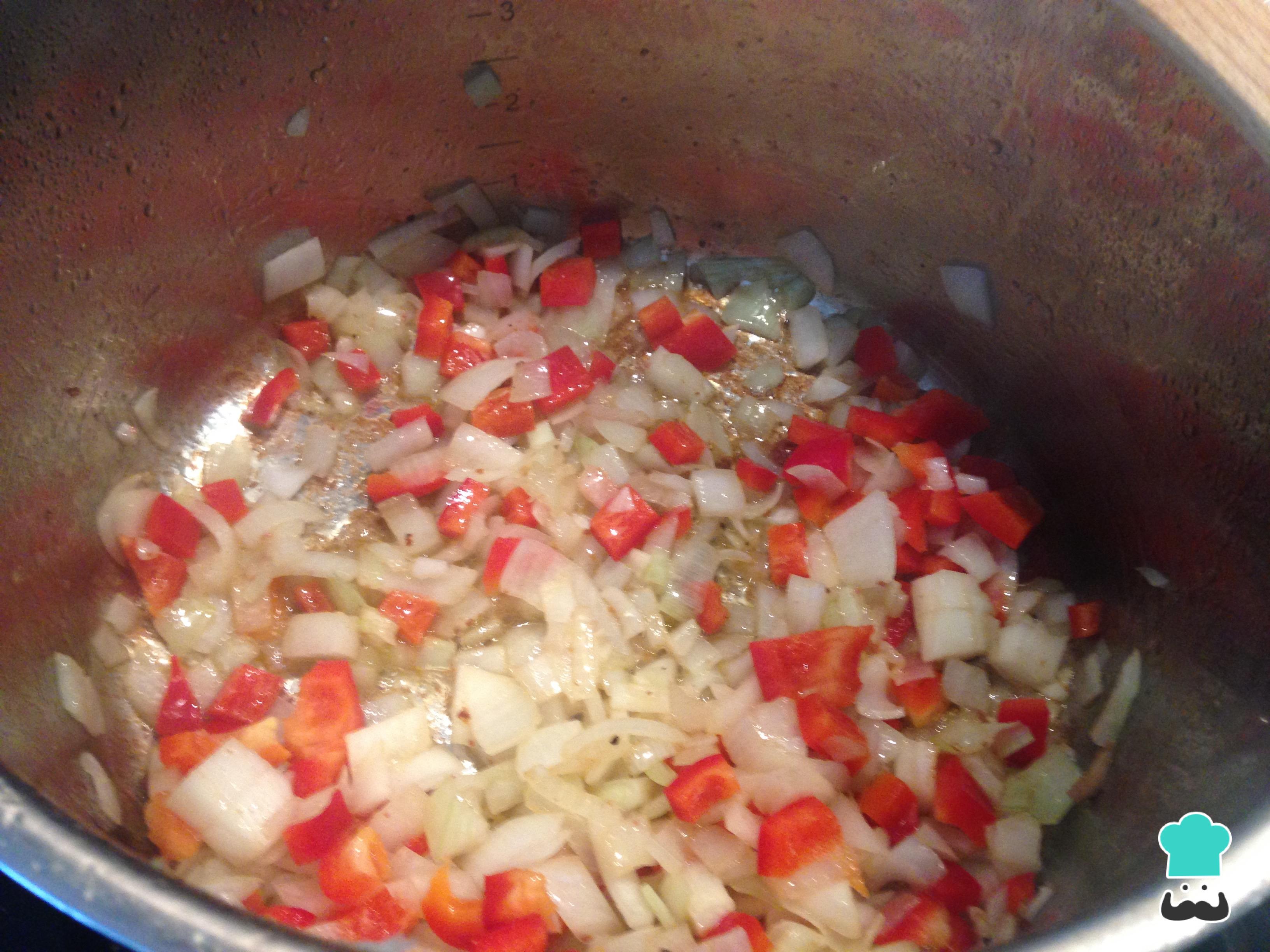 En la misma olla, sofreímos la cebolla cortada en dados junto con el pimiento rojo.