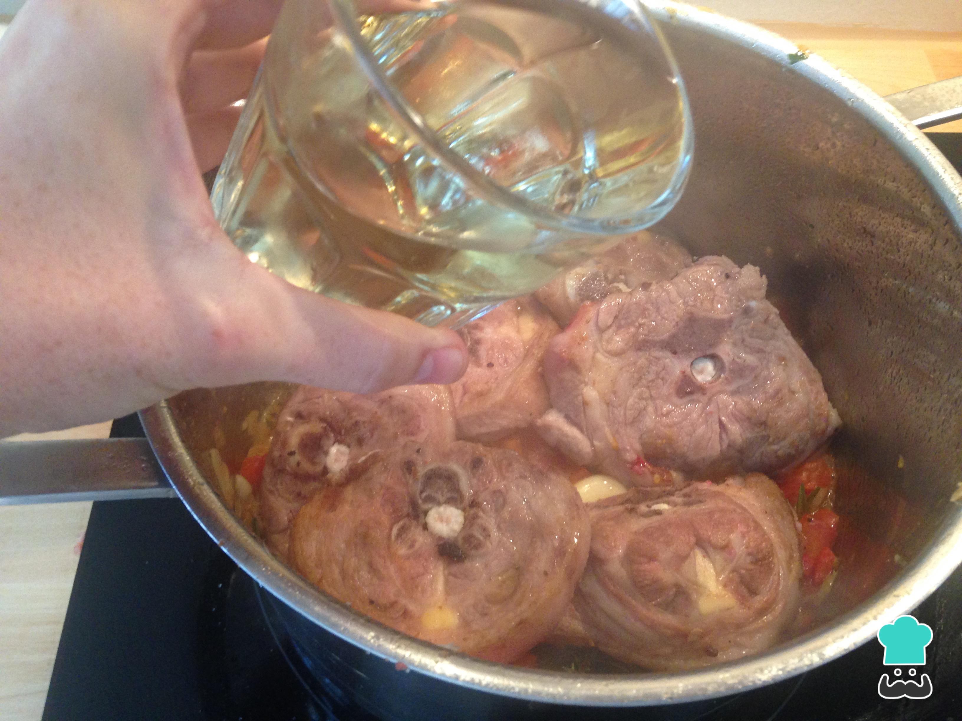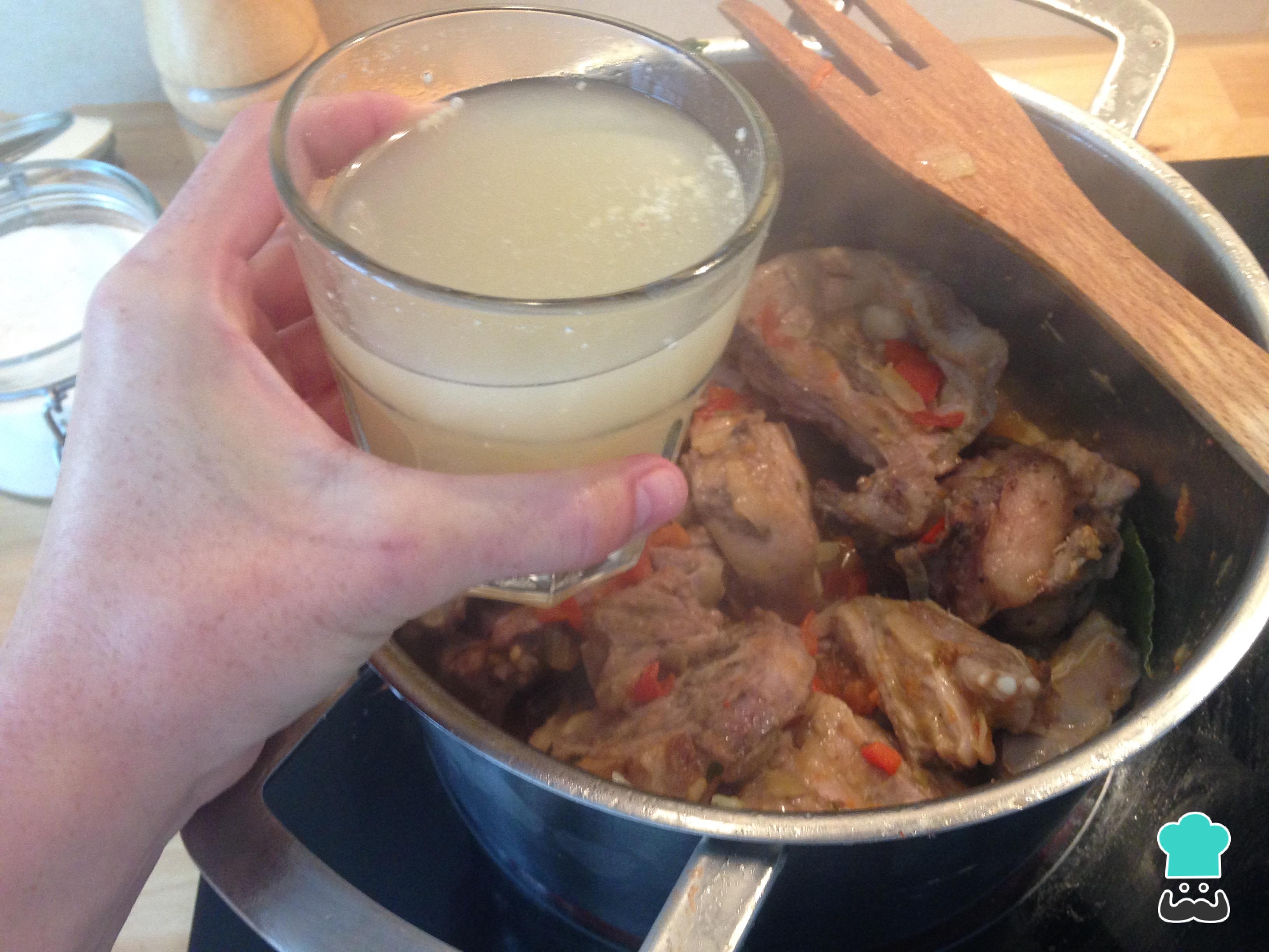 Continuamos con nuestra caldereta de cordero agregando el vino blanco. Dejamos evaporar el alcohol durante un par de minutos.