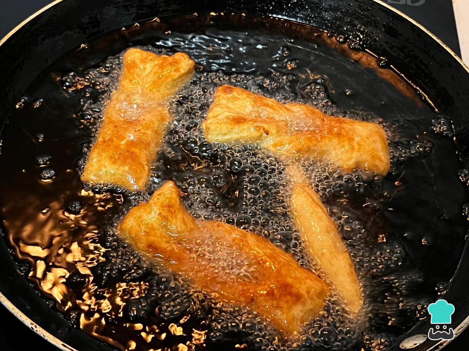 Calienta abundante aceite en una olla o sartén profunda. Una vez caliente (puedes probar con un pequeño pedazo de masa), fríe los calzones rotos en tandas, dándole la vuelta hasta que estén dorados por ambos lados.