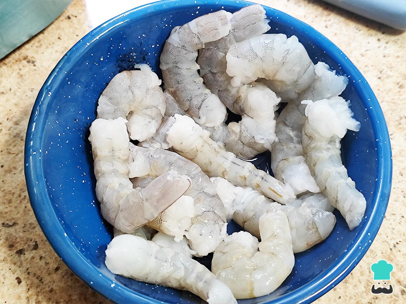 Para comenzar lava y pela los camarones. Retira la vena central y sécalos con papel absorbente, luego rocía con el jugo de limón, sal y pimeinta y reserva.