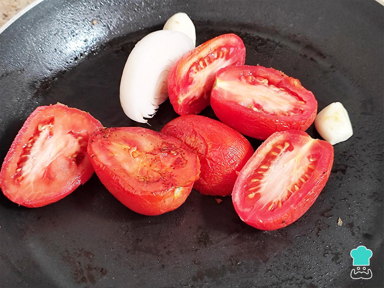 Licúa los jitomates, los dientes de ajo, la cebolla y los chiles chipotle con un poco de agua, puedes usar chile seco o en adobo y puedes agregar más o menos según prefieras el picor.