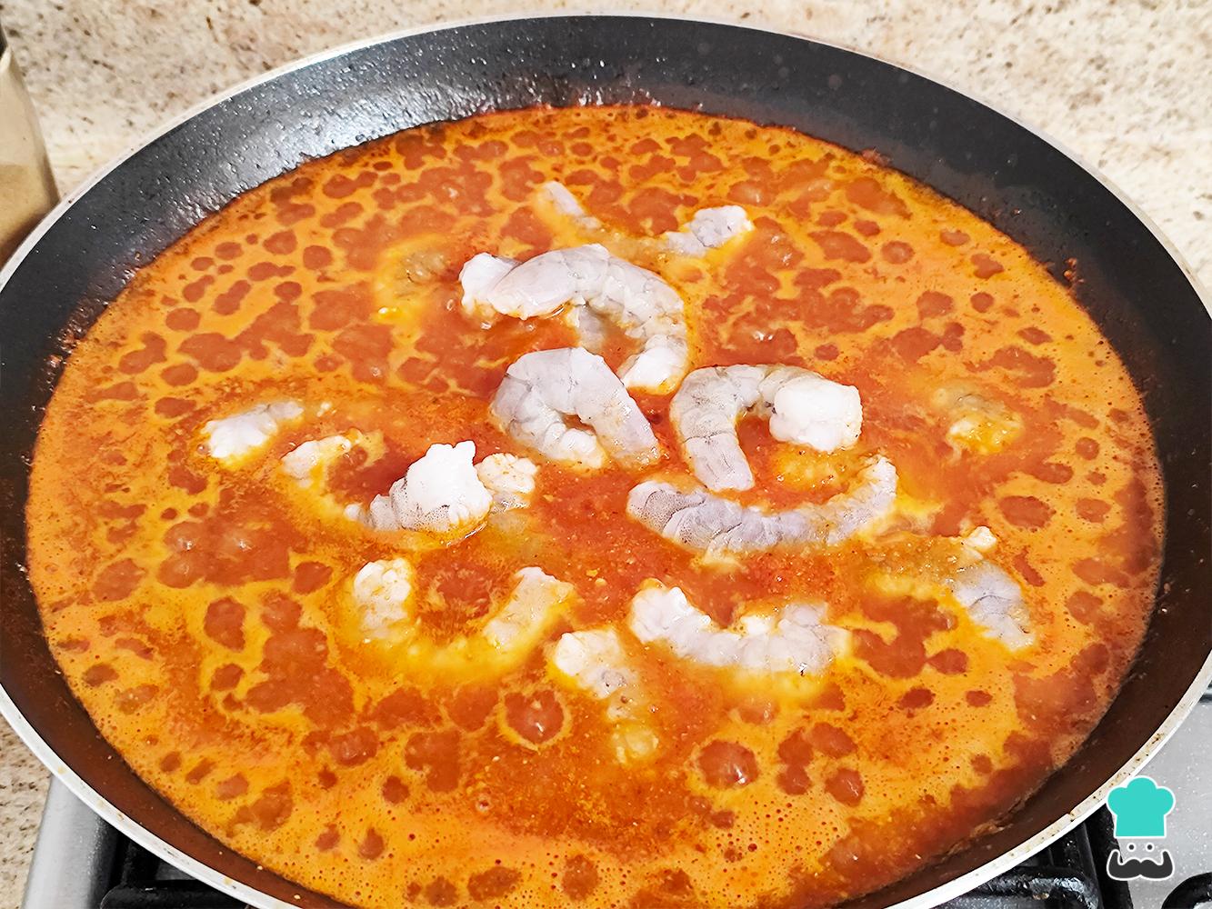 Cuando la salsa comience a soltar grasa, agrega los camarones y cocina durante 3 a 5 minutos o hasta que cambien de color a uno rosado, evita sobrecocer.