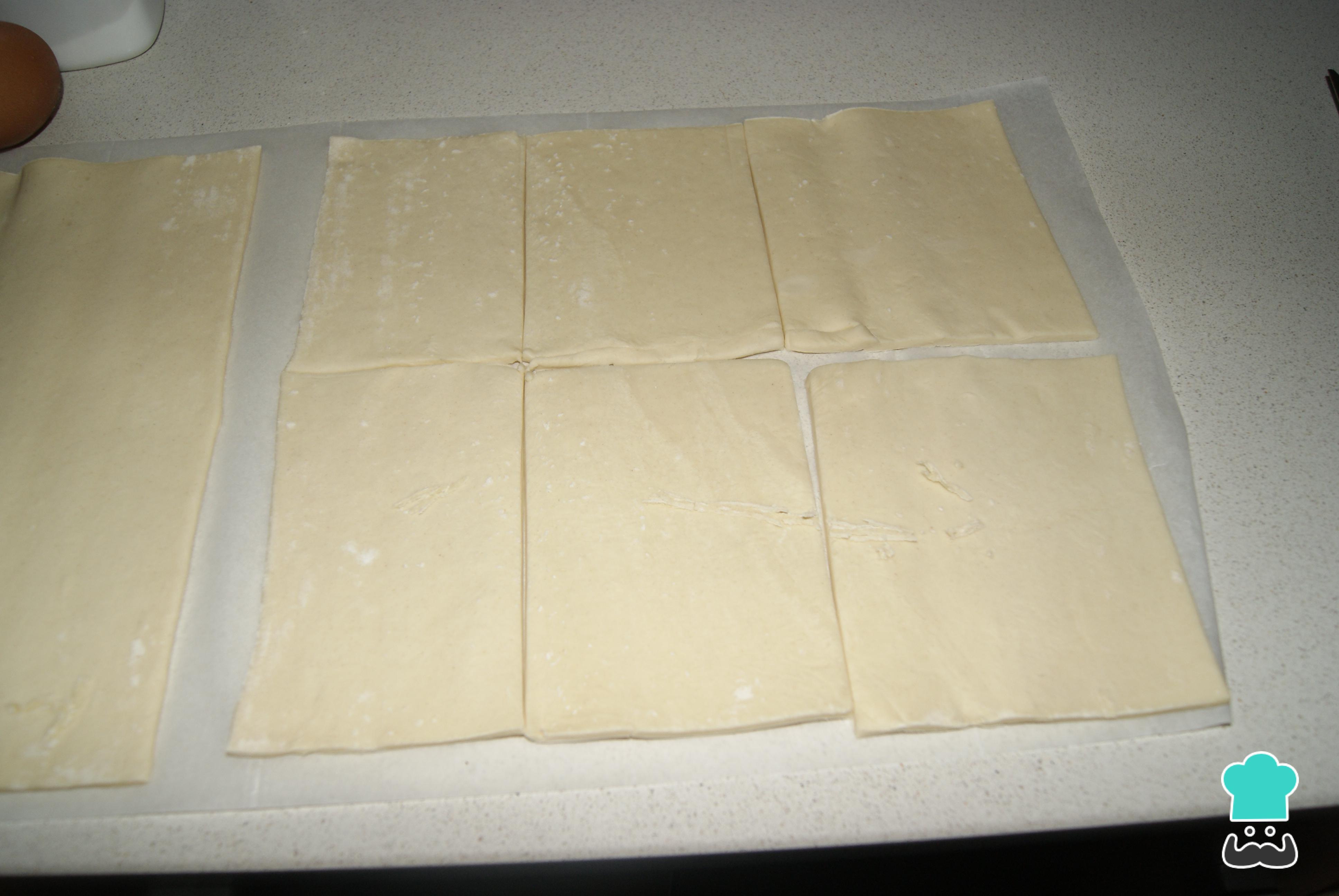 Empezamos por cortar las piezas de hojaldre para hacer nuestras mini cañas. Entonces, extendemos las láminas sobre la base de papel vegetal y hacemos tres cortes de forma que nos queden 6 rectángulos en cada lámina, tal como se ve en la foto.