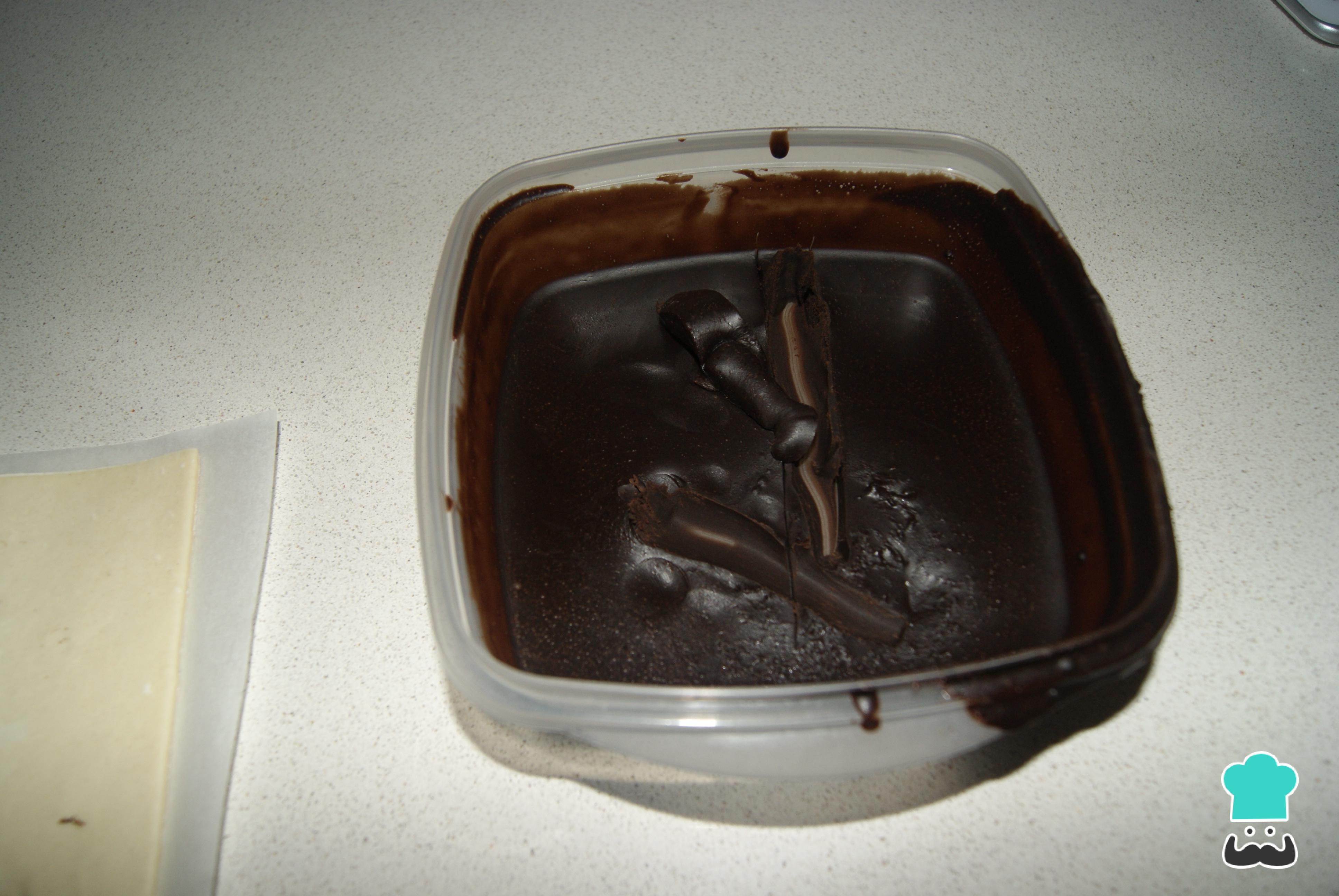 Fundimos el chocolate al baño María con un par de cucharadas de agua. Dejamos enfriar, pero no del todo, para poder cogerlo bien con una cuchara. La idea es que el chocolate se mantenga semi líquido.