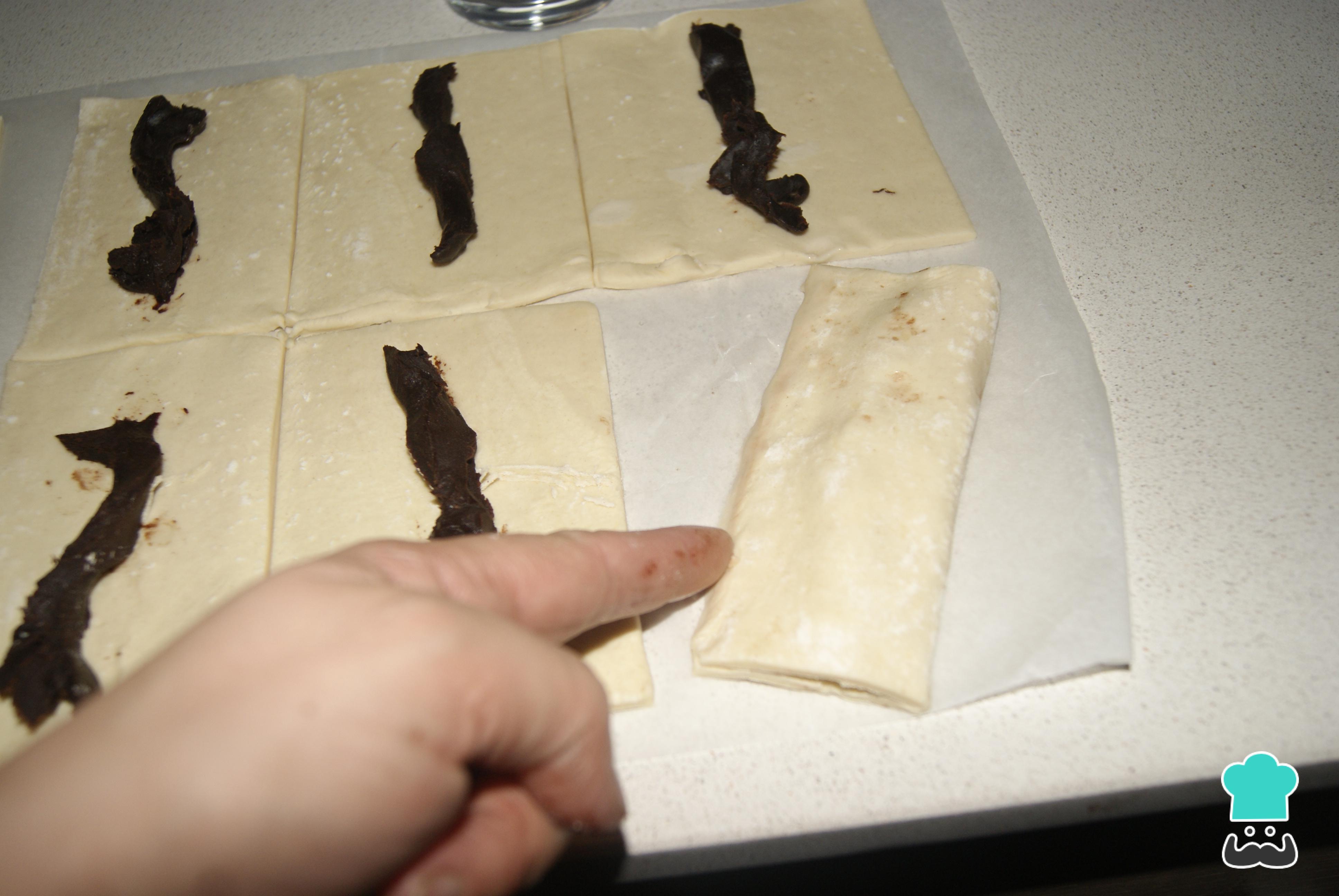 Hacemos las cañas de chocolate, colocando una porción de chocolate fundido en el centro de cada pieza. Luego, con el dedo mojado en agua, sellamos los bordes de la masa para que no se abra durante la cocción.