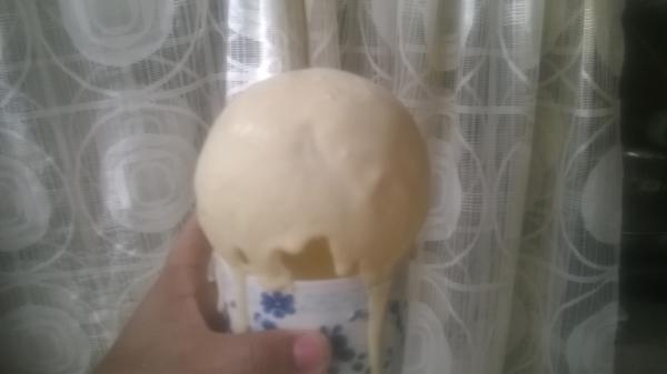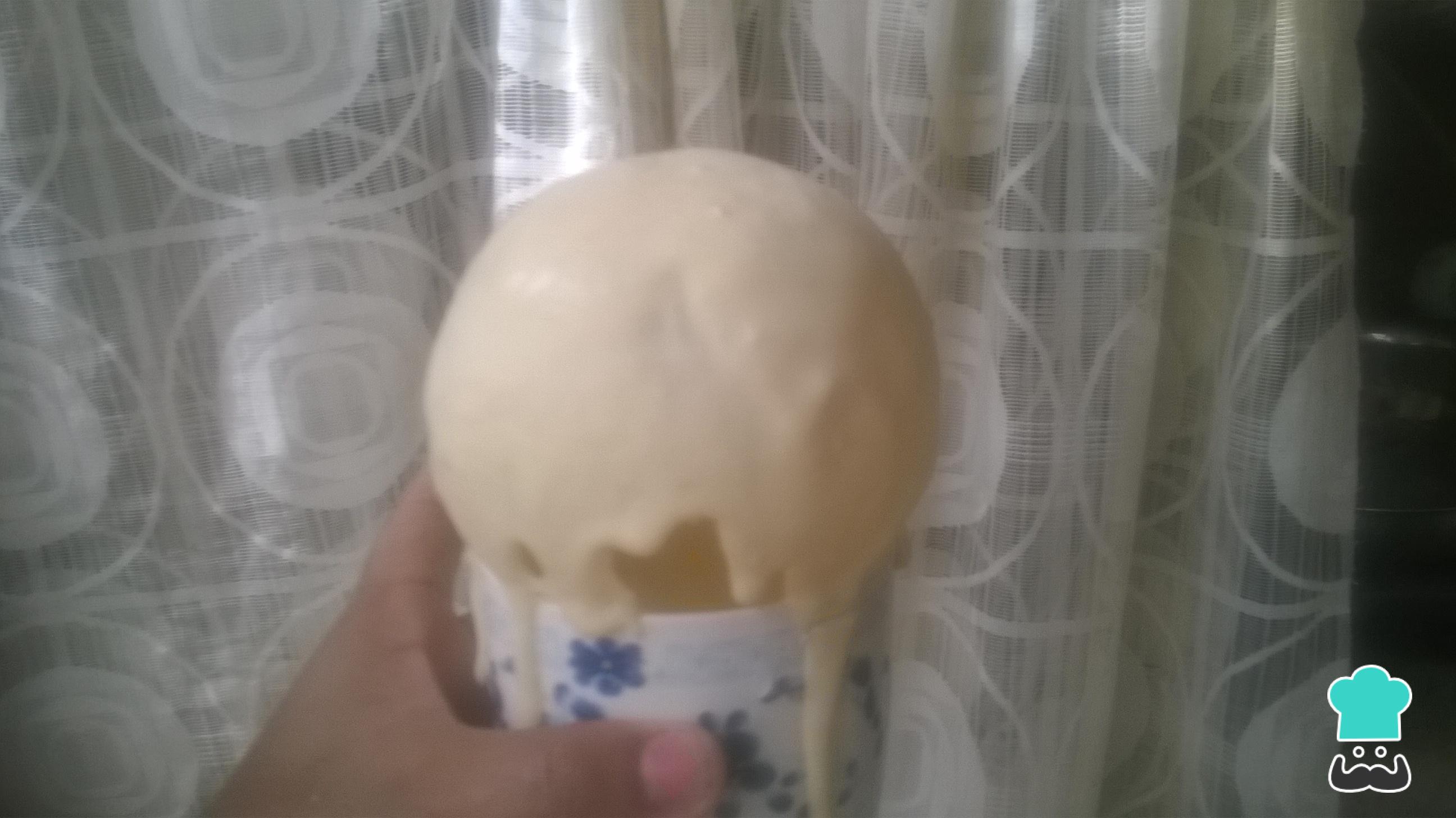 Deja reposar el chocolate casi hasta enfriar. Luego, infla los globos y vierte el chocolate por encima, tal y como se muestra en la fotografía. Pon todos los globos cubiertos por chocolate blanco en la nevera para que endurezcan las canastas. No lo viertas caliente, se te explotará el globo.