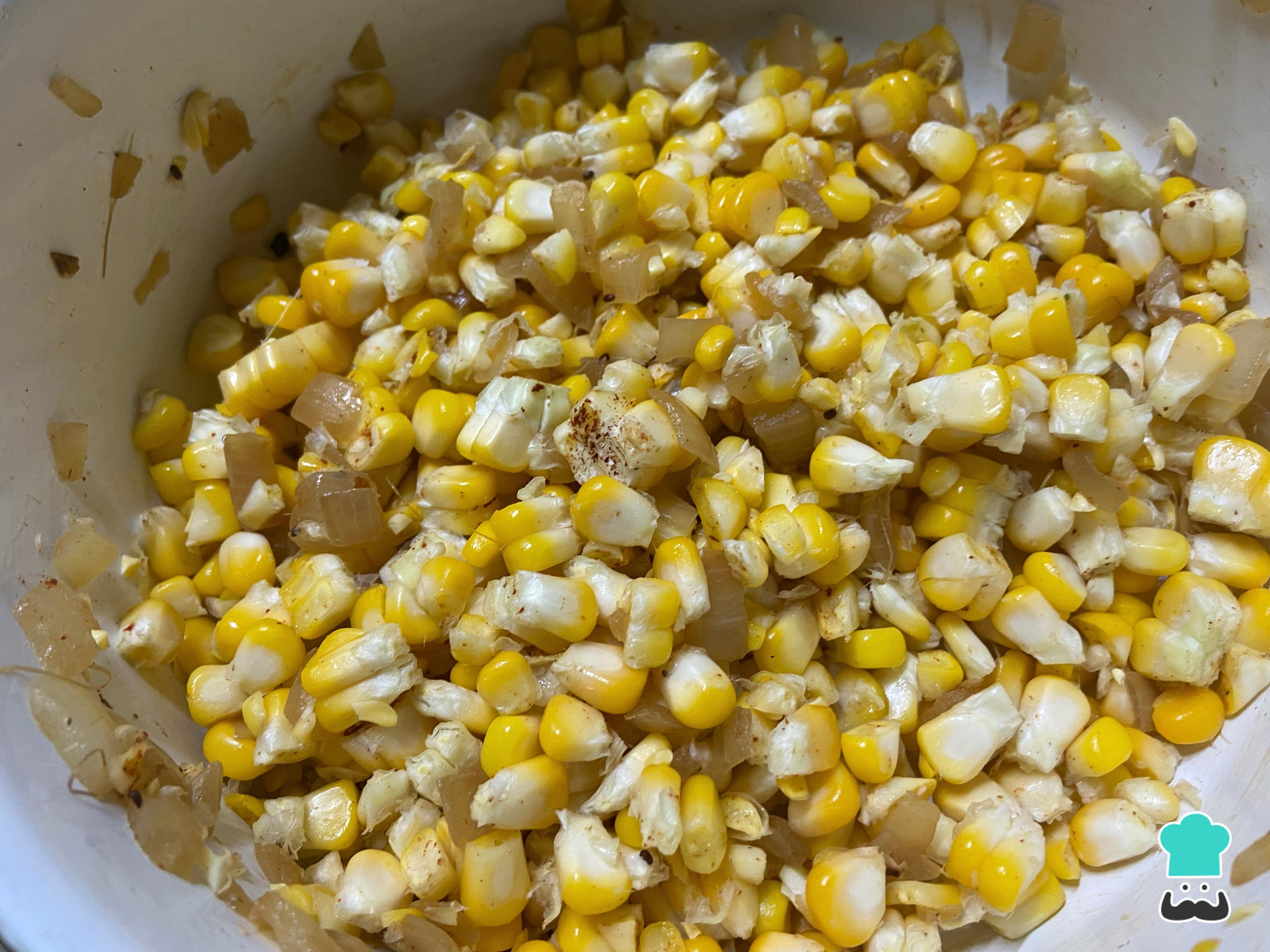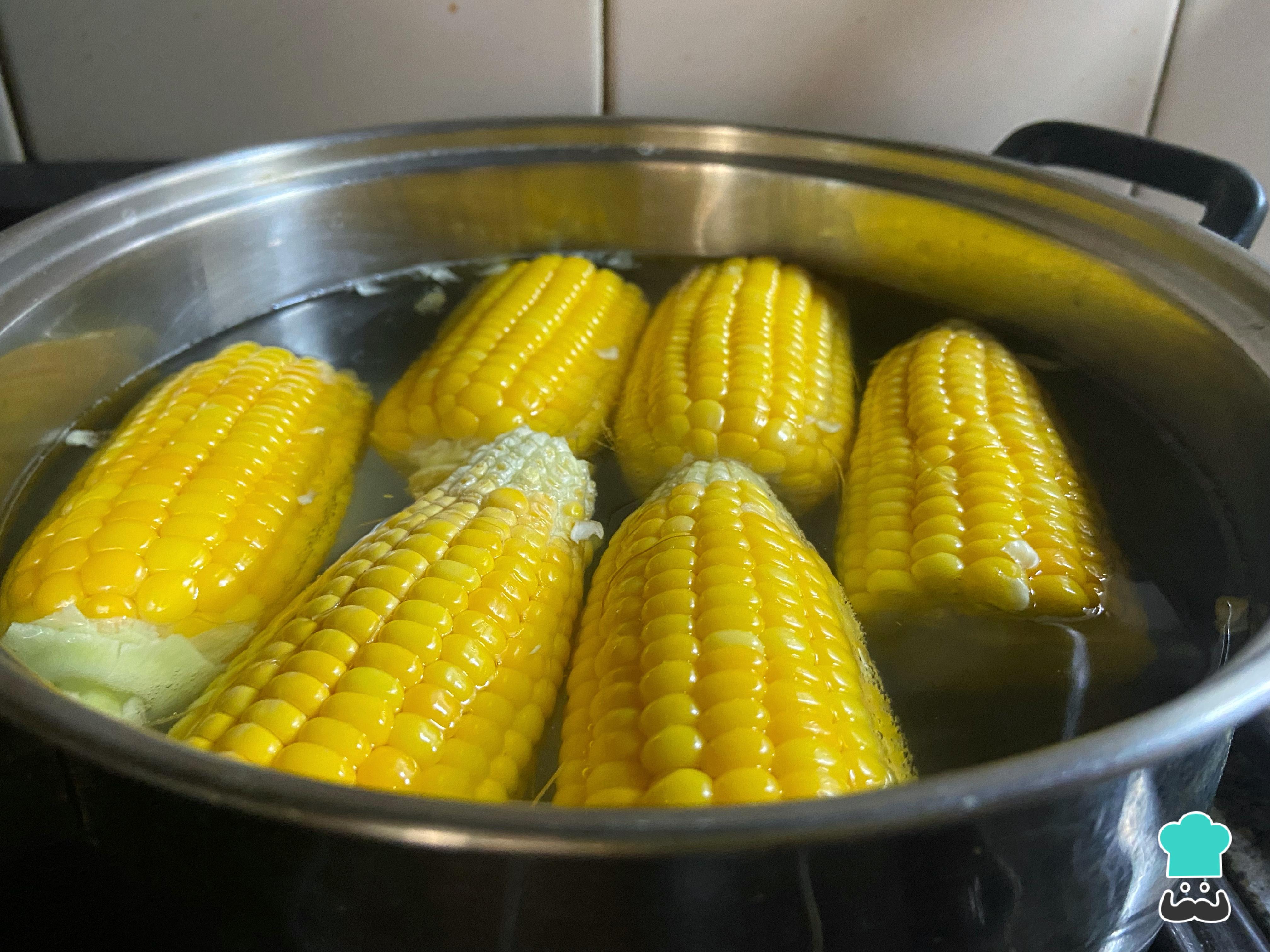 Mientras, hierve los choclos cortados por la mitad para que su cocción sea pareja y rápida. Aproximadamente deben estar unos 8-10 minutos, conviene girarlos cuando pase la mitad del tiempo. Verás que toman un color amarillo brillante. Resérvalos para que se enfríen y desgránalos.