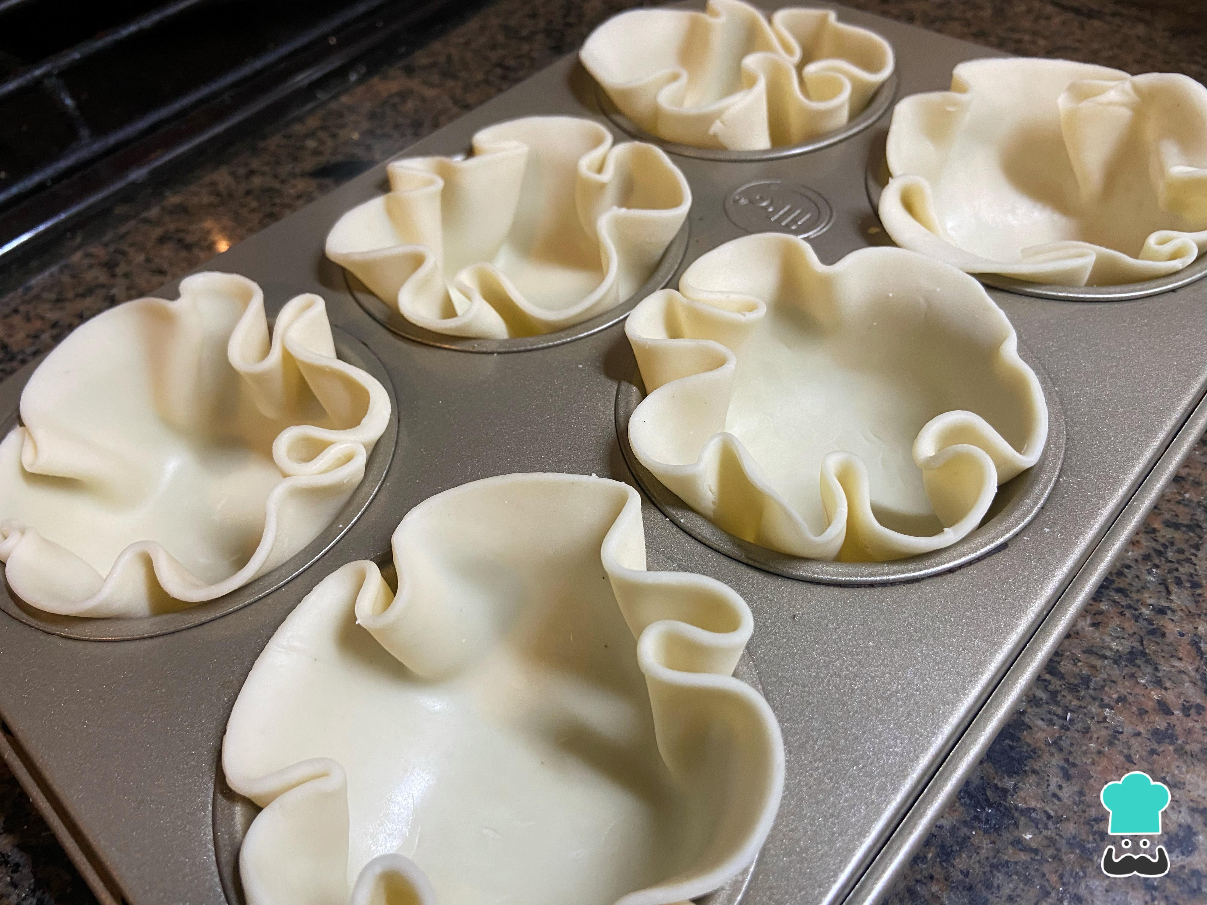 Cubre un molde para muffins con las canastitas con tapas de empanadas. Cocínalas en el horno fuerte durante 3 o 4 minutos.