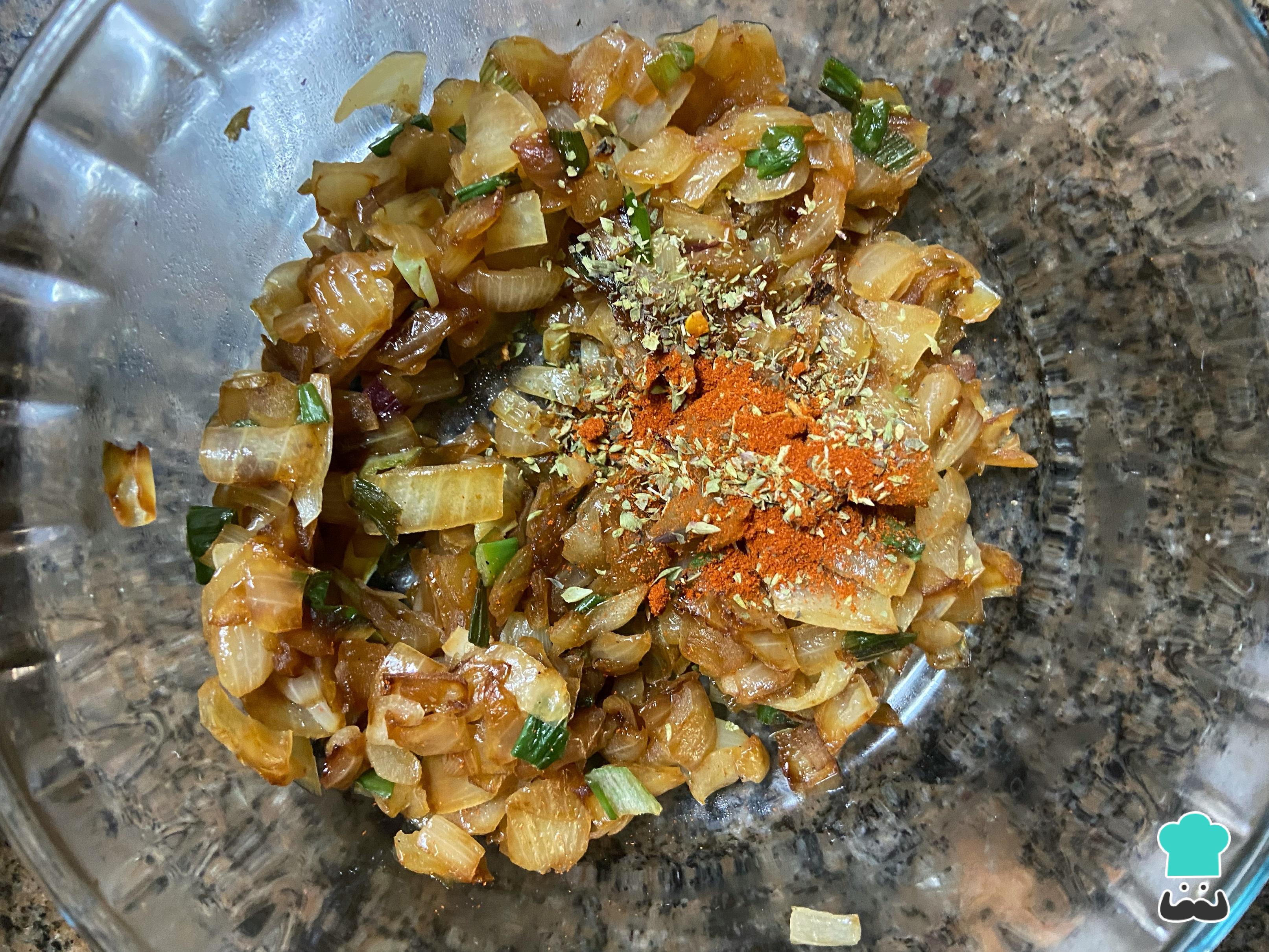 Condimenta las cebollas con el orégano y pimentón al gusto. Añade también el queso cortado en cubos.