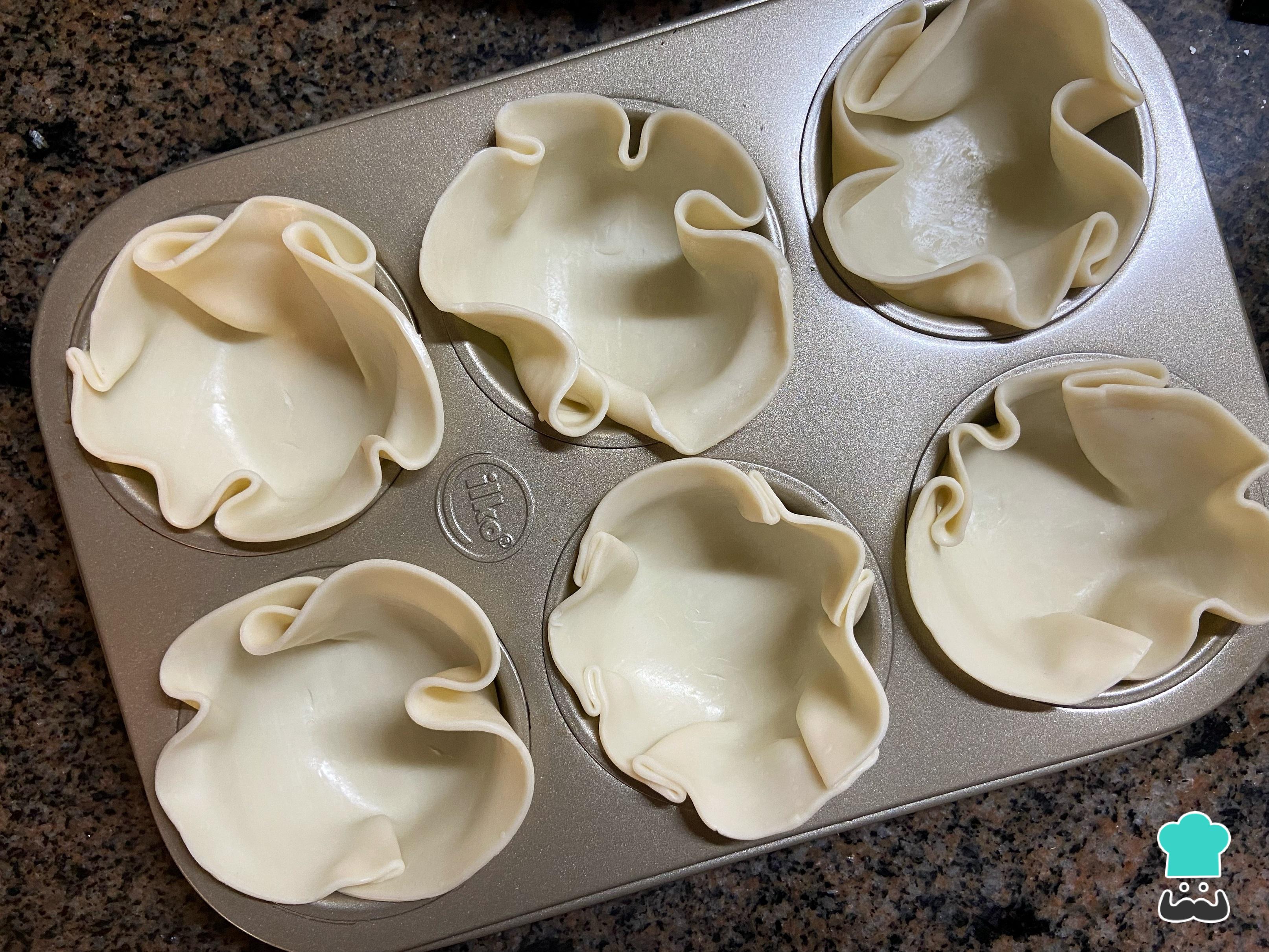 Si no tienes este tipo de moldes, puedes utilizar los moldes de magdalenas, debes colocarlos del revés, es decir, cubriendo la base con la masa, como observas en la imagen. Cocina las tapas unos 5 minutos en el horno hasta que estén ligeramente doradas.