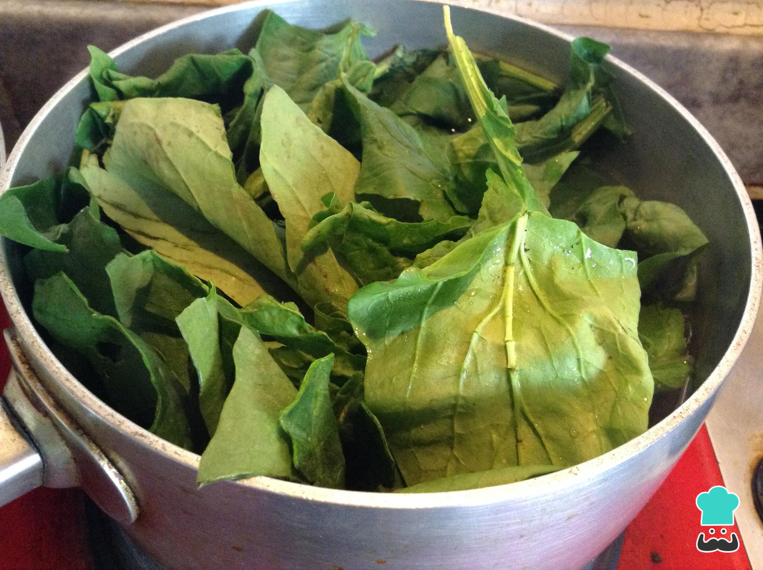 Ahora pasamos a cocinar las espinacas. Para ello, debes lavar bien las hojas y retirar los tallos. Luego, llevar una olla con agua a fuego medio y una vez esté hirviendo, adicionar la espinaca con un poco más de agua.