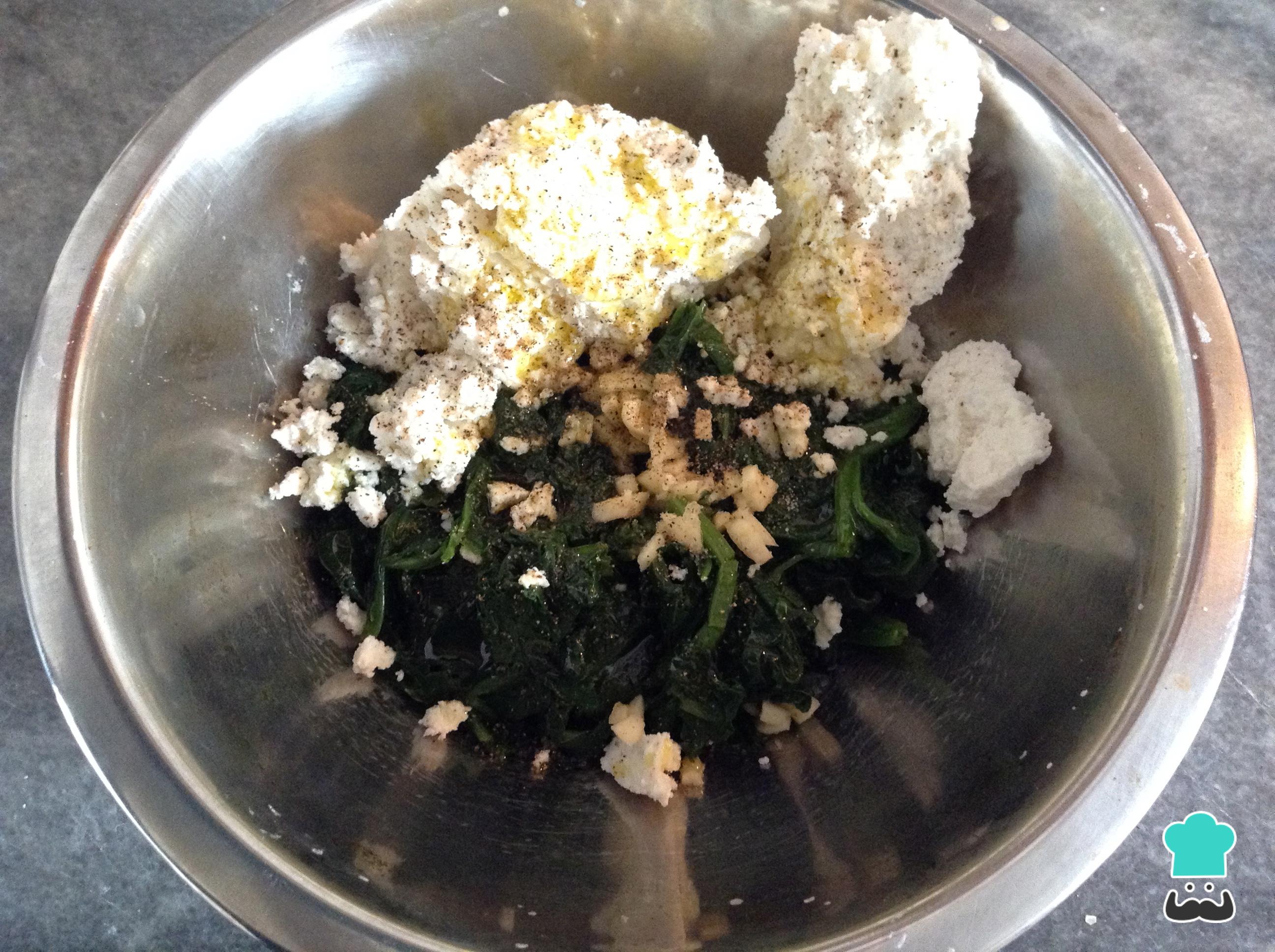 Llevar nuestras espinacas cocinadas a un bol y mezclar con el queso ricotta, una cucharada de aceite de oliva, sal, pimienta y los ajos finamente picados. Mezclar bien hasta integrar todos los ingredientes.