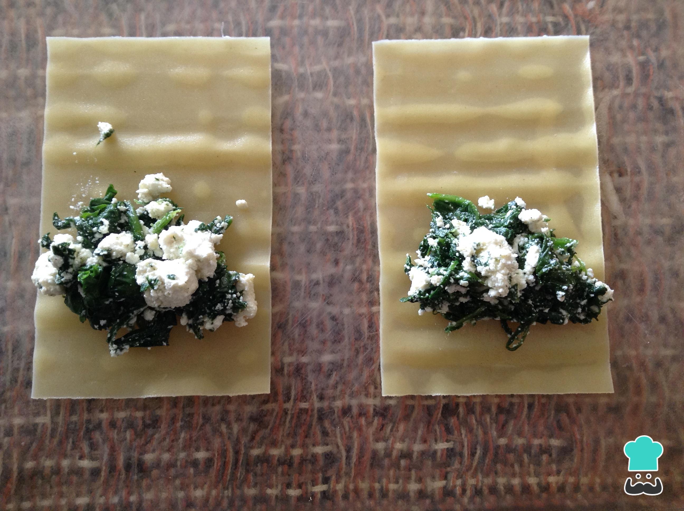 Rellenar los canelones de espinaca y ricotta envolviendo muy bien cada uno de ellos. Debes extender cada lamina, colocar una cucharada de relleno en el centro y envolver, haciendo la típica forma de los canelones.