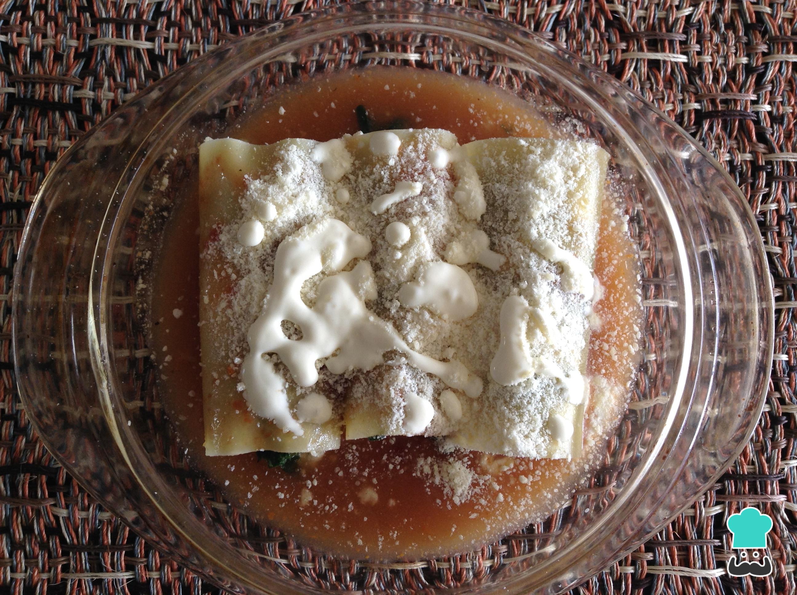 Llevar los canelones de espinaca y ricotta a una refractaria y bañar con la salsa napolitana, adicionar queso parmesano encima y una cucharada de crema de leche al gusto.