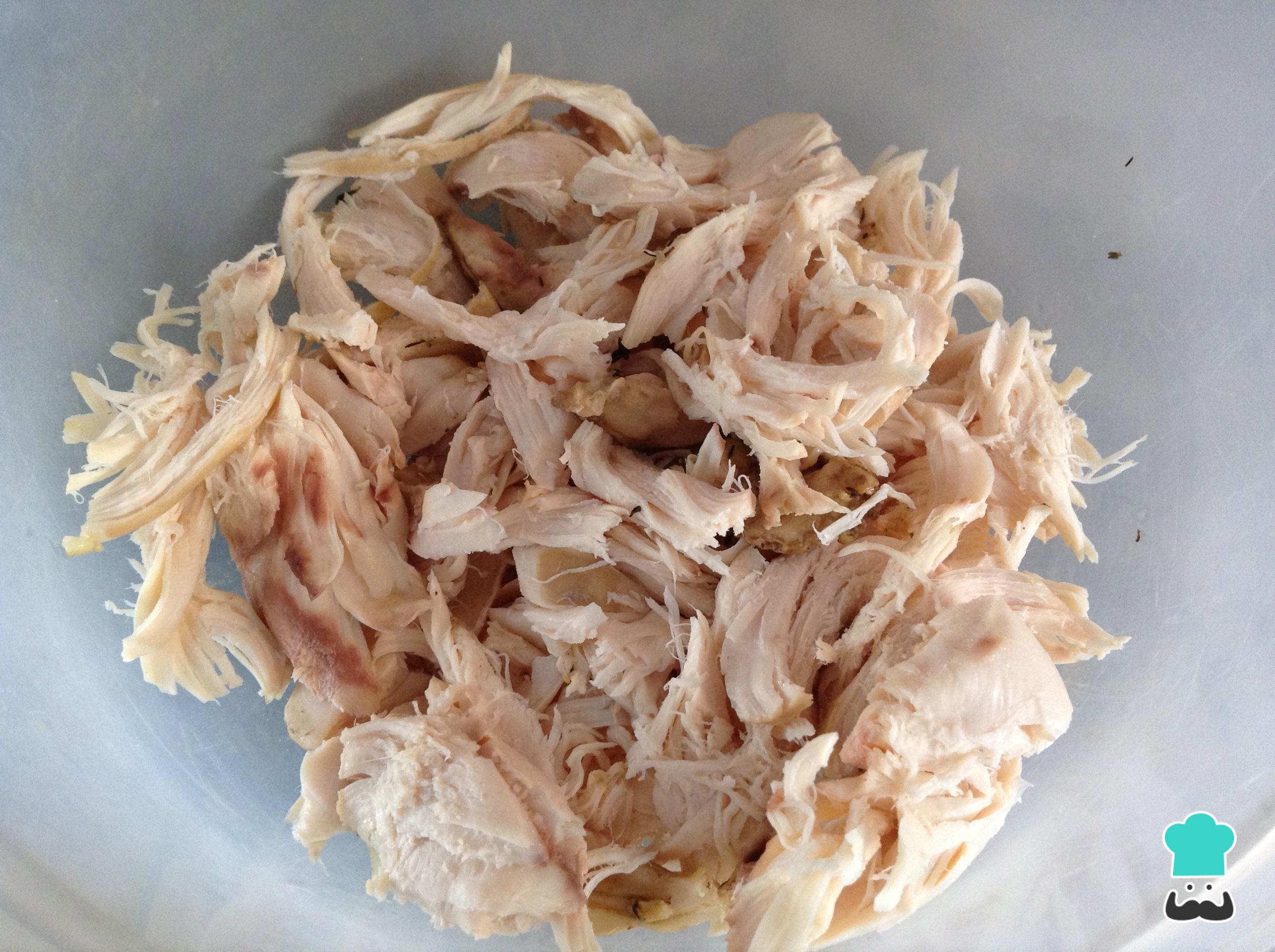 Una vez frías las pechugas desmechar el pollo para realizar el relleno de los canelones de pollo en salsa roja.Reservar el pollo desmechado.