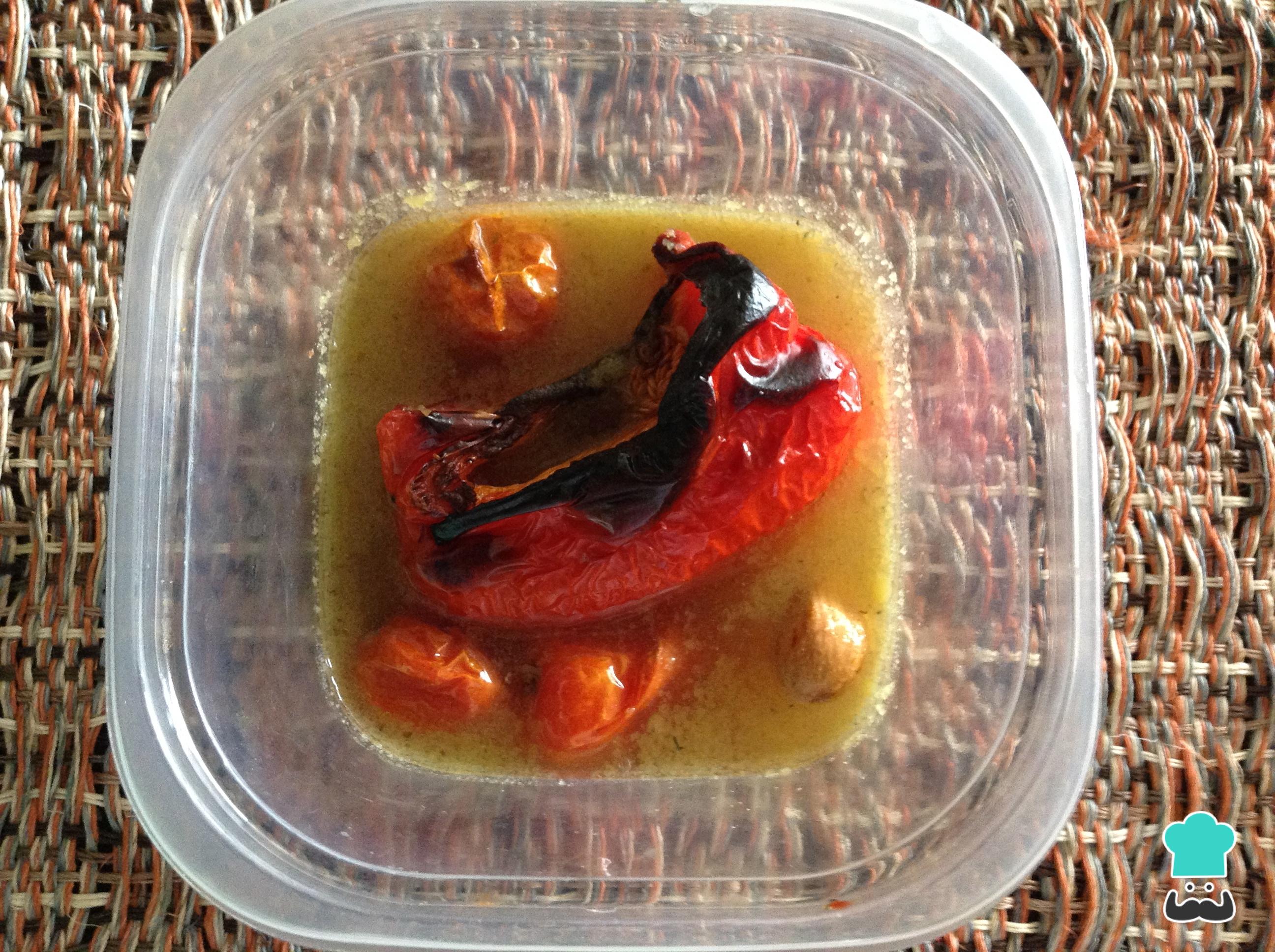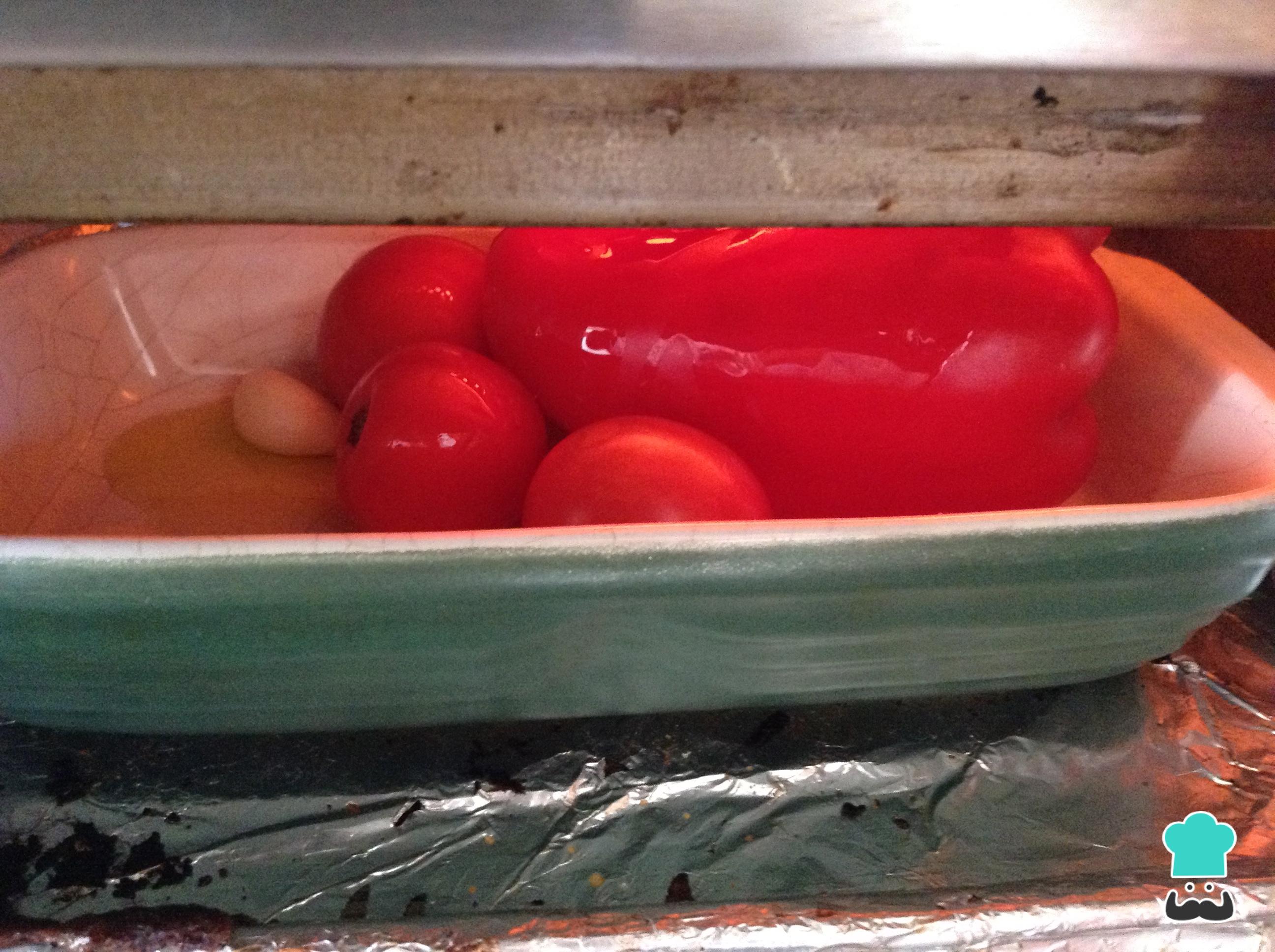 Lavar las verduras en este caso los tomates, los pimentones o pimientos y retirar la cascara de cubre el ajo.Rostizar en el horno roceando con un poco de aceite de oliva, sal y pimienta.Rostizar a 120 grados centígrados durante 30 minutos.