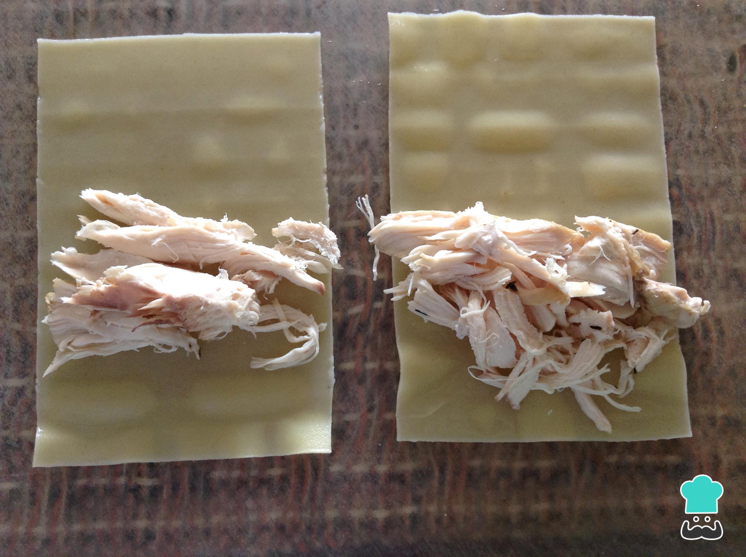 Rellenar cada uno de los canelones con el pollo desmechado y envolver con mucho cuidado, llevar cada uno de los canelones a una refractaria y bañar con la salsa roja encima y adicionar si se quiere como algo adicional queso parmesano.Importante que los canelones de pollo en salsa roja se bañen con abundante salsa.
