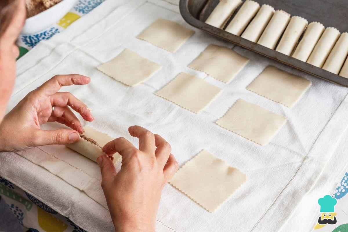 Con todo listo, iniciamos el montaje de los canelones. Coloca una cucharada de relleno en el centro de cada placa. Después, enrolla con cuidado para formar el cilindro clásico que resultará el canelón y, cuando estén todos enrollados, colócalos en una fuente previamente untada con un poco de mantequilla para evitar que se peguen.
