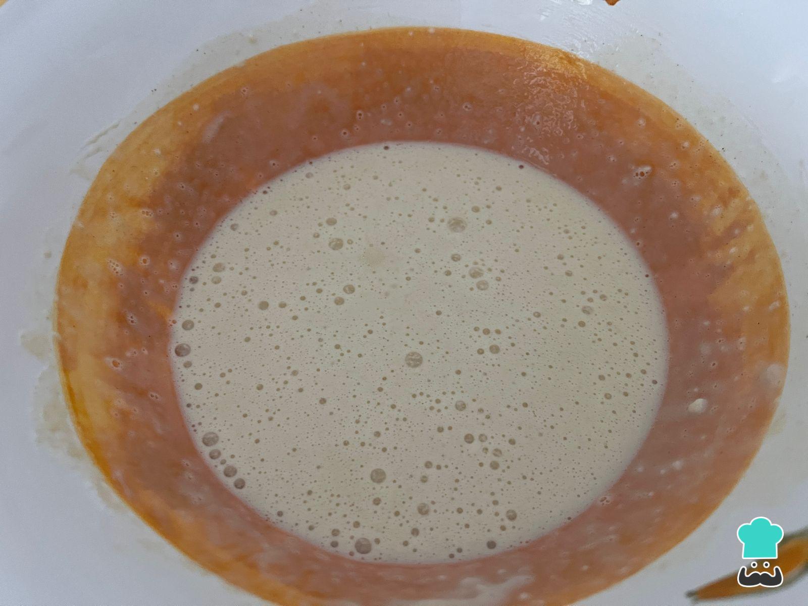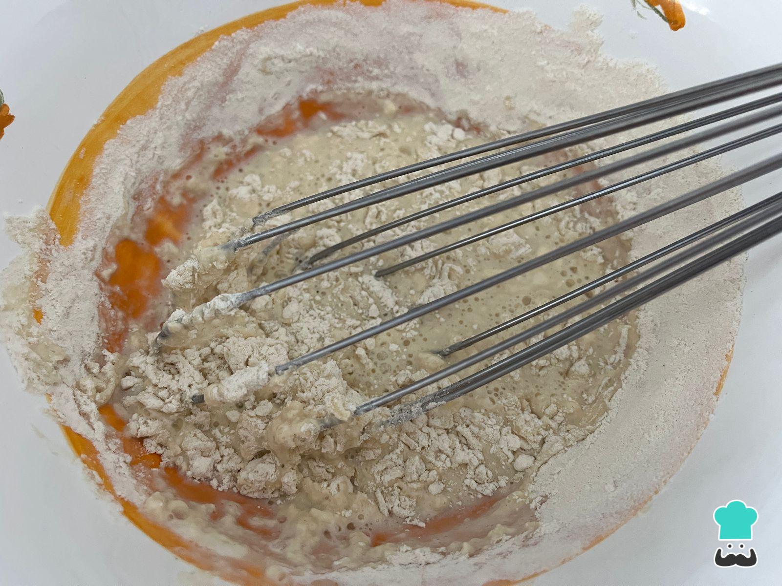 Agrega la harina con ayuda de un tamiz o colador fino para evitar grumos. Mezcla con un batidor de mano para integrar completamente y deja reposar unos 10-15 minutos para que la harina se hidrate.
