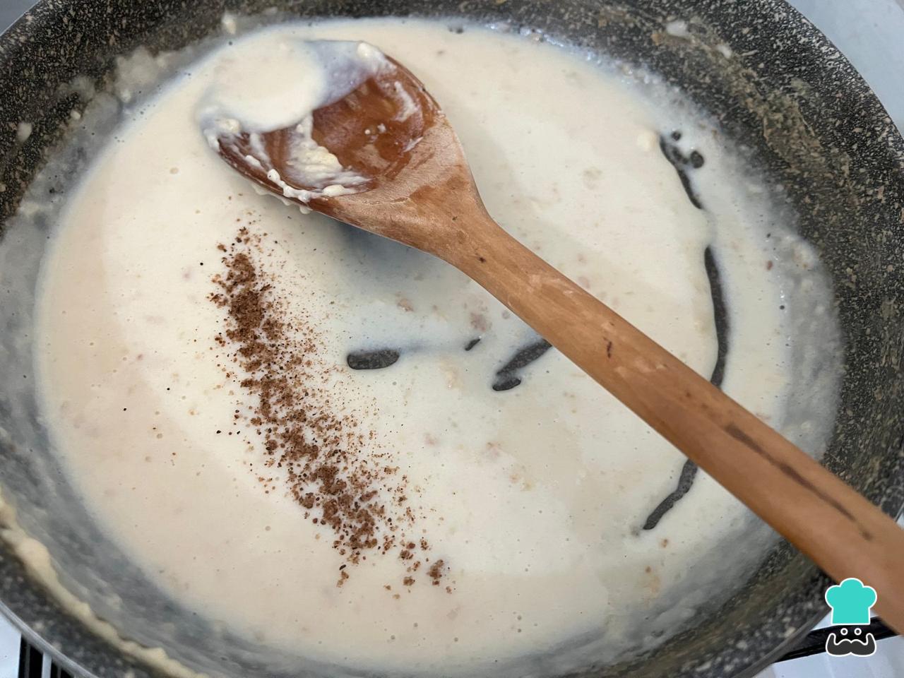 Agrega más cantidad de leche a la otra mitad de salsa blanca y condimenta también al gusto con nuez moscada y pimienta. Usaremos esta salsa para cubrir los canelones para calentarlos en el horno.