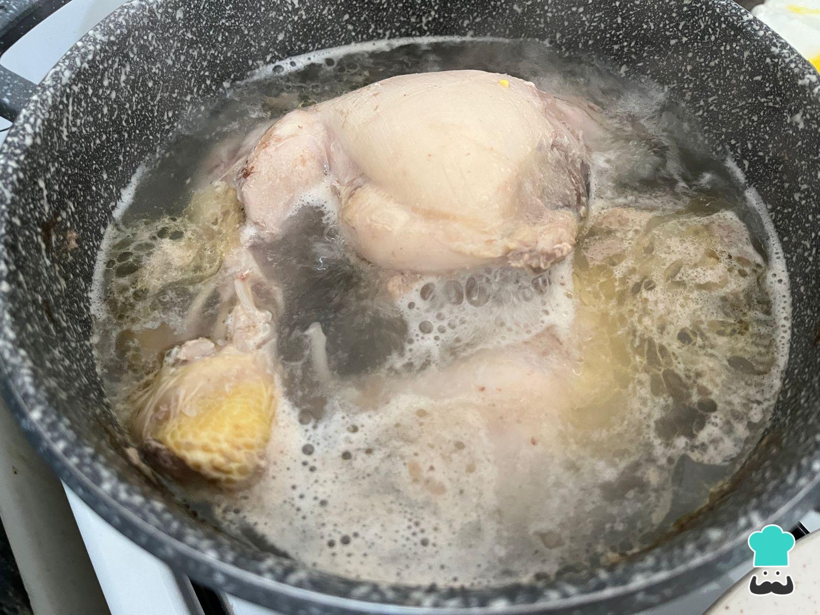 Cocina el pollo hervido por unos 30 minutos. Puedes agregar al agua otras verduras como apio, zanahoria, puerro o condimentos como ajo y laurel para aportar más sabor.
